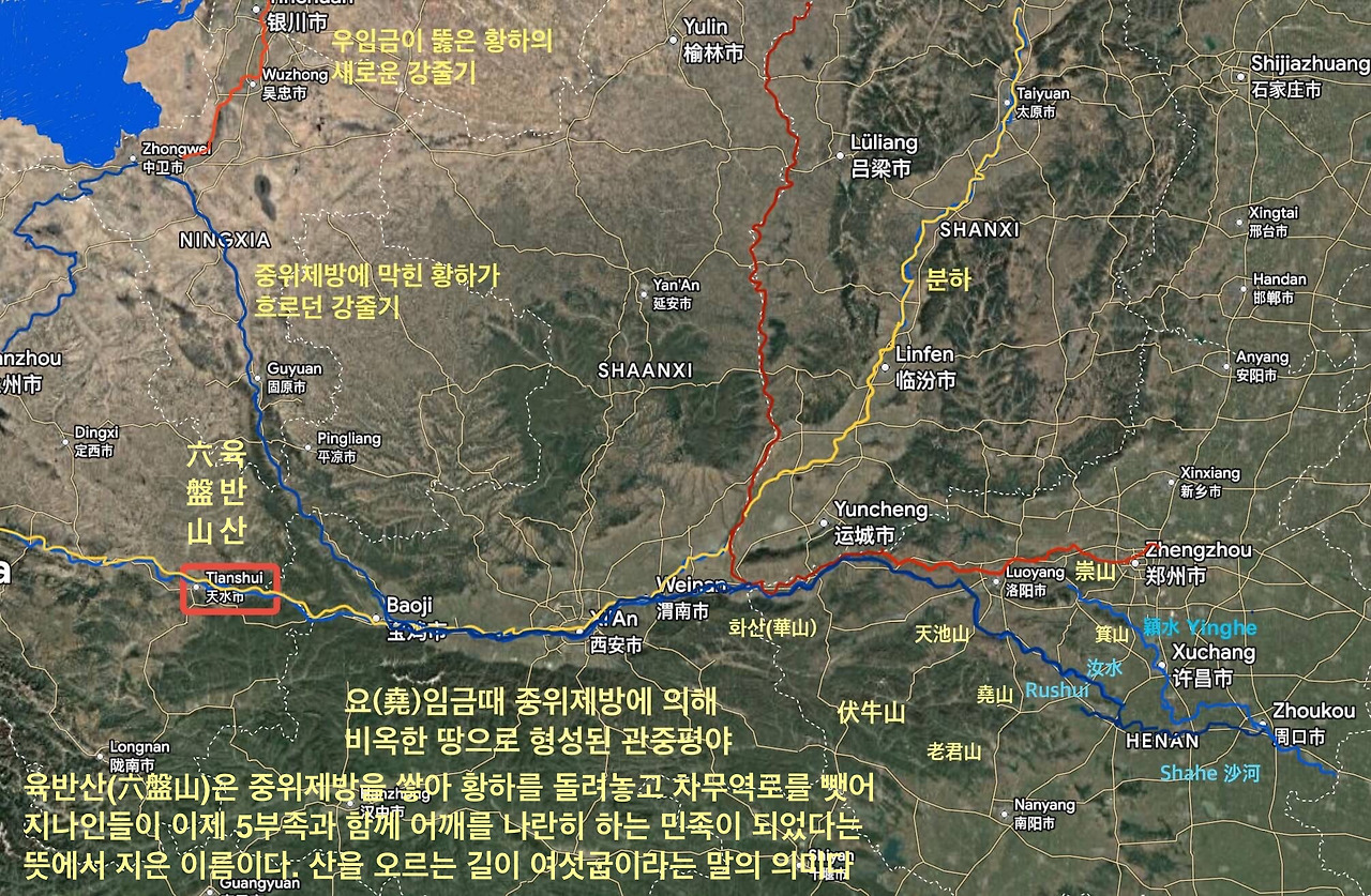 황하(黃河)를 몽골 고원으로 흐르지 못하게 하기 위해 중위(中衞)에 쌓아 올려진 제방(堤防)은 그것을 주장하고 밀어붙인 왕(王)을 흙더미를 쌓았다는 의미로 요(堯)라고 부르게 했고 그렇게 해서 요(堯) 임금이 차지한 땅은 방죽(堤防)이란 뜻의 당(唐)이라고 불렸다. 지금도 그 땅은 섬서성(陝西省)이라고 부르는데 섬서성의 섬(陝) 자는 도둑질한 것을 가졌다는 뜻의 숨길 섬(㚒) 자가 부수인 글자였다. 그래서 중국인들은 지금도 섬서성(陝西省)을 산서성(山西省)과 똑같이 발음한다. 기후 한랭화로 인해 몽골고원을 적시던 강(江)들의 원천인 알타이를 포함한 시베리아의 모든 골짜기의 물줄기들이 얼어붙자 남쪽 몽골 고원으로 유입되던 수량(水量)이 대폭 줄어들었고 황하마저 요(堯) 임금의 제방(堤防) 건설로 패해(浿海)로 유입되지 않자 몽골고원을 가로질러 흐르던 패수(浿水)의 수량(水量)이 대폭 줄어들어 몽골고원은 극심한 가뭄에 시달리게 되었다. 원래 매일 한 개씩 돌아가며 하늘로 떠오르게 되어있던 10개의 태양이 한꺼번에 떠올라 극심한 가뭄이 들자 요(堯) 임금이 예(羿)에게 부탁해 그중 9개의 태양을 활로 쏴 떨어뜨려 간신히 가뭄을 해결했다는 중국 전설은 이때의 사정을 말하는 이야기였다. 예(羿)가 동시에 떠오른 10개의 태양중 9개의 태양을 화살을 쏘아 떨어뜨리고 얼마 지나지 않아 사기(史記)에 기록된 9년간의 대홍수가 벌어졌다. 9년 동안 계속되었다던 요(堯) 임금 때의 대홍수는 비가 많이 와서 벌어진 일이 아니었다. 요(堯) 임금 때 공공(共工)이 쌓은 제방(堤防)이 무너져 패해(浿海)의 물과 황하의 물이 범람(氾濫)했기 때문이었다. 홍수(洪水)의 홍(洪) 자가 공공(共工)이 판축으로 켜켜이 쌓은(共) 방죽(堤防)에 물이 넘쳐 들어오는 것을 상형한 글자인 연유였다.