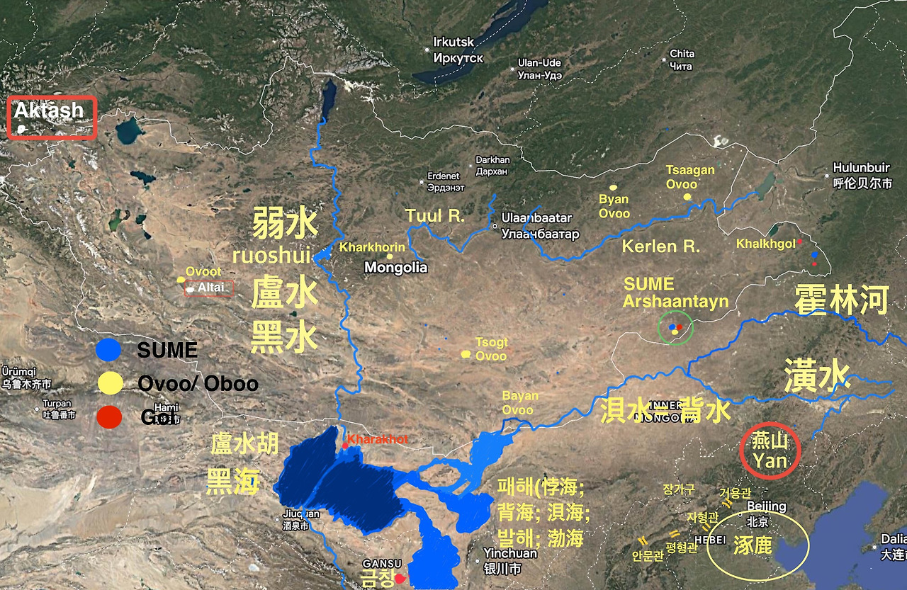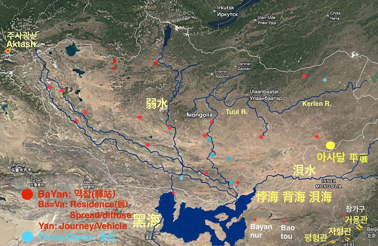 바(Ba=Va)가 사람뿐만 아니라 낙타와 말들을 위한 거주 시설(residence)이 제공되고 주사(朱砂)가 보급(spread)되는 곳이라는 뜻이었다면 옌 또는 얀(yan)은 말과 낙타(駱駝), 수레들 같은 운송수단(vehicle)을 제공하는 곳이라는 의미였다. 대륙의 서쪽으로 가는 긴 여정(旅程) 동안 차(茶)를 싣고 가는 낙타와 말 그리고 수레는 손상이 가는 경우가 많았고 따라서 반드시 새로운 말과 낙타, 수레들이 보충되어야만 하는 경우가 많았는데 이와 같은 카라반의 필요를 충족시켜 주는 곳이 옌(Yan; 燕)이었다. 주무왕(周武王)이 너무 일찍 죽어 야기된 혼란한 정국을 주공(公) 단(旦)과 함께 안정시킨 소공(召公) 석(奭)이 그 공로로 받은 봉토가 황제헌원이 배달국으로부터 뺏은 탁록(涿鹿) 지역이었는데 이 탁록지역은 바다를 통해 배를 타고 중국 동해 연안으로 상륙한 차상인(茶商人; merchant)들이 배에서 내린 찻잎들을 낙타와 말들이 끄는 수레에 옮겨 싣고 아사달로 떠나는 출발지역이었다. 그래서 이 지역을 고대로부터 옌(Yan; 燕)이라고 부른 연유였다. 지금 중국의 강소성(江蘇省) 서주(徐州)와 숙천(宿迁) 사이에 있는 호수가 낙마호(駱馬湖)라 불리는 연유이기도 했다. 연(燕)이란 지역은 대륙의 서쪽을 가기 위해 중국지역을 통과해야 했던 차상인(茶商人)들에게 낙타(駱駝)와 말, 수레 같은 운송수단들을 제공하는 곳이어서 붙여진 이름이었다. 야마토인들이 바둑을 고(ご; Go)라고 하는 연유는 바둑의 바(Va:Ba) 자가 거주지(居住地; dwelling, residence)라는 뜻이었기 때문이었다. 위에서 설명한 바와 같이 대륙의 동서를 가로지르며 나아가야 했던 카라반들은 거친 들판에서 수백 마리의 낙타와 말들과 함께 야영(野營)으로 숙식(宿食)을 해결해야 했고 그래서 무역로(貿易路) 중간에 설치된 특별한 역참(驛站)에서 반드시 휴식과 물자 보충을 해야만 했다. 이런 특별한 시설들이 있는 곳을 바(Va, Ba; 居住地)라고 했고 바(Va; 居住地)의 위치를 표시한 바둑을 일본인들은 자신들의 말로 거(居)를 뜻하는 고(ご; Go; 居)라 부른 것은 당연했다.