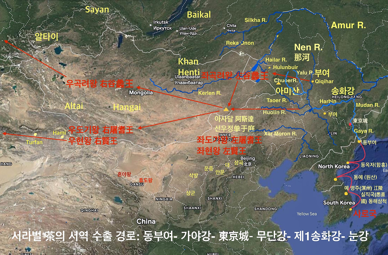 두만강(豆滿江)을 모란강(牡丹江)과 연결하는 가야강(加耶江) 유역에 터 잡아 나진(羅津)과 두만강 모란강 수계(水系)를 모두 관리하는 동부여(東扶餘)를 별도로 세워 금와(金蛙)를 보내 서라벌(徐羅伐)에서 올라오는 차(茶)들을 관리하여 부여(夫餘)로 수송케 한 것은 흉노의 대분열이 일어난 기원전 60년이었다. 하루빨리 흉노의 분열을 수습하고 부여의 차(茶)를 확실하게 파르티아(Parthia)까지 수출할 수 있도록 북도(北道)라 불린, 대월지(大月氏)를 축출하고 흉노가 운영한 천산북로(天山北路)와 천산남로(天山南路)를 다시 안전하게 보호해 줄 친부여 흉노 정권을 수립하기 위해서는 더욱 많은 질 좋은 차(茶)가 있어야 했다. 금와(金蛙)는 유능하게 일처리를 해냈고 부여(夫餘)의 이런 신속한 지원(支援)은 질지선우(郅支單于)가 한(漢) 나라의 지원을 받는 호한야선우(呼韓邪單于)를 누르고 대분열을 짧은 시간 안에 수습할 수 있게 해 준 원동력이었다. 이때 큰 기여를 한 것이 나진이었는데 나진(羅津)이란 이름은 삼척(三陟), 동해(東海)의 실직국(悉直國)과 명주(강릉)의 예(濊), 원산의 동예(東濊)를 거쳐 두만강 하구로 올라온 서라벌(徐羅伐)의 차(茶)를 하역하는 선창(船艙)이 설치되어 있는 곳이어서 붙여진 것이었다. 질지(郅支) 선우가 다른 네 명의 선우(單于)를 누르고 흉노를 통일한 건 중국이 차재배 (茶栽培) 성공을 연호(年號)인 감로(甘露)에 담아 공식 선포하기 바로 전해인 기원전 54년이었다. 지금의 사천성(四川省) 아안(雅安)의 몽산(蒙山)에서 성공한 인공적인 차나무 재배는 기원전 53년 인공(人工) 재배(栽培)한 차(茶) 나무에서 딴 찻잎으로 차(茶)를 만들어 한(漢) 황실에 공납(貢納)함으로써 감로(甘露)라는 연호를 만들어 주었다. 한(漢) 나라가 차(茶) 나무 재배에 성공했다는 소식은 몽산차(蒙山茶)인 감로(甘露)의 보급과 함께 빠르게 퍼져나갔고 퍼져나간 만큼 부여와 흉노 연합의 결속력도 떨어져 갔다. 부여와 가까운 동흉노(東匈奴) 보다 멀리 있는 서흉노가 더 많이 동요(動搖)했고 동부여보다 북쪽에 있는 숙신(肅愼)이 더 흔들렸다. 결국 질지선우(郅支單于)가 서흉노의 동요(動搖)를 잠재우고자 서역으로 가야만 했고 그 후 질지 선우는 다시는 돌아오지 못했다.