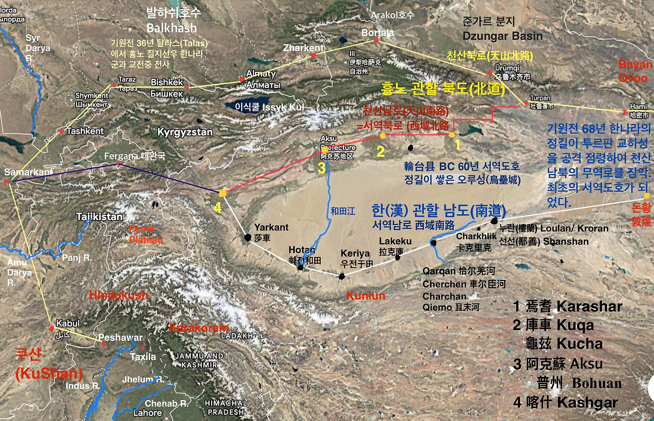 기원전 69년 전한(前漢) 선제(宣帝)의 사변적(事變的)인 차(茶) 나무 재배(栽培) 정책을 눈치챈 부여(夫餘)가 근역(槿域; 한반도)에 박혁거세 원정단을 파견해 지금의 경주를 중심으로 형산강(兄山江)과 태화강(太和江) 유역을 모두 점령한 후 왜(倭)와의 차무역(茶貿易)을 통제하자 사람들은 그 지역을 서라벌이라고 부르기 시작했다. 그러자 한(漢) 나라는 정길(鄭吉)이 이끄는 군사를 투르판(Turfan) 근처 거여(渠黎)에 파견해 부여(夫餘)에게 부응(副應)할 가능성이 있는 서역 나라들을 감시토록 했는데 후일 중국 역사상 최초의 서역도호(西域都護)가 되는 정길(鄭吉)은 다음 해인 기원전 68년 차사(車師)를 공격해 점령해 버렸다. 차사(車師)는 지금의 신강성 투루판(Turfan)으로 고창(高昌)으로 불리던 지역인데 기후변화로 알카나이(Alkhanai)와 아스타나(Astana)를 연결하는 초원로(草原路)가 얼어붙을 때마다 대체(代替) 무역로로 사용된 북도(北道)라고 통칭된 우루무치를 통과하는 천산북로(天山北路)와 지금의 고거(庫車 Kuqa)인 쿠차(龜玆 Kucha)를 지나는 천산남로(天山南路)의 두 개 무역로(貿易路)가 분기(分岐)되는 중요한 역참(驛站)이 있던 곳이었다. 그래서 도하(渡河)가 어려운 두 개의 강 사이에 위치한 교하(交河)의 높은 지역에 성곽을 건설하고 수도로 삼은 차사국을 형면제(刑免除)를 조건으로 내건 1500명의 죄인들로 구성된 하찮은 둔전병(屯田兵)들을 이끌고 결정적인 시점에 정길(鄭吉)이 점령해 버린 거였다. 성곽(城廓)을 두른 요새(要塞) 도시 투르판을 한(漢) 나라의 정길이 그 약소한 전력(戰力)으로 점령해 버리자 만천하에 빈천한 실력이 드러난 흉노(匈奴)는 그 책임 문제로 혼란에 휩싸였다. 게다가 한(漢) 나라의 고창(高昌) 교하성(交河城) 점령은 북도(北道)로 불린 천산북로(天山北路)와 천산남로(天山南路)의 동서(東西)를 잇는 두 개의 무역로(貿易路) 통제권을 한(漢) 나라가 흉노(匈奴)에게서 빼앗은 것으로 상징되어 서역(西域) 여러 나라들을 혼란에 빠뜨리고 있었다. 교하성이 함락되고 같은 해에 흉노의 호연제(壺衍鞮) 선우가 사망하자 그의 동생인 허려권거선우(虛閭權渠單于)가 즉위했는데 허려권거는 흉노(匈奴)의 전통인 수계혼(收繼婚)을 지키지 않고 죽은 형의 아내인 전거연지(顓渠閼氏)를 내쫓아 문제를 더욱 꼬이게 만들었다.