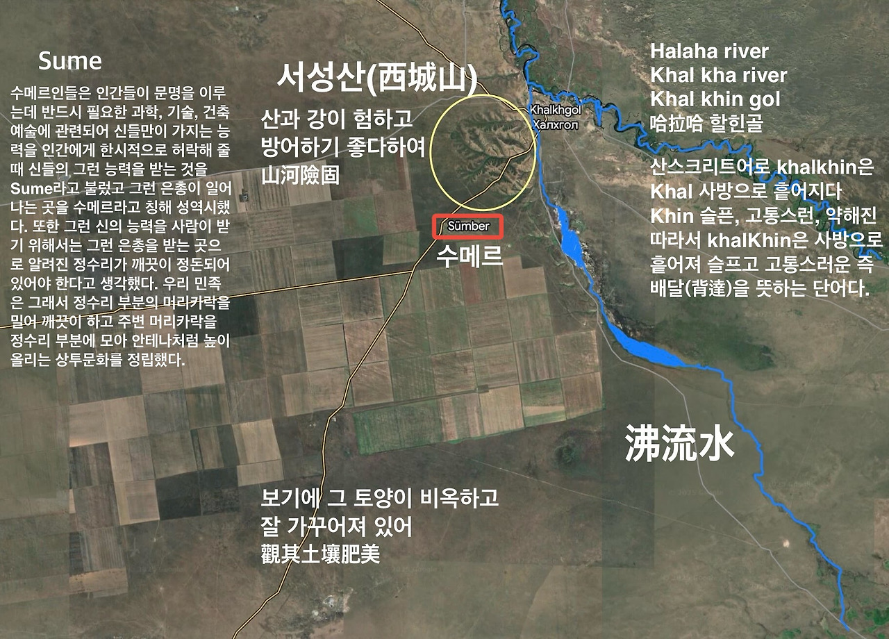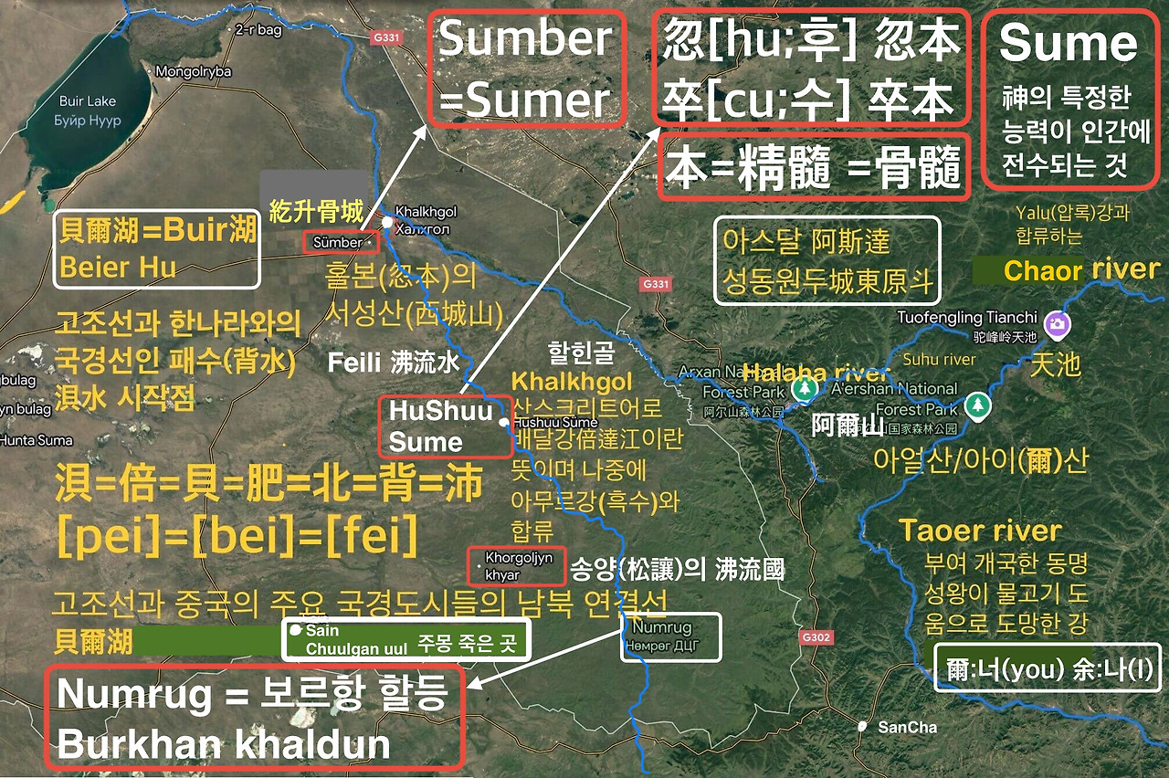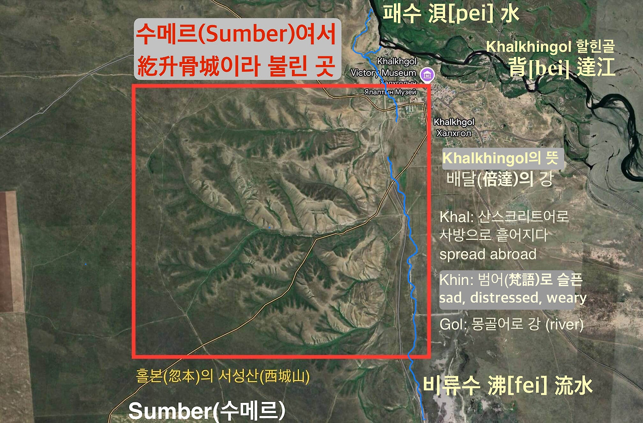 몽고 공화국의 눔룩 지역을 할힌골(Khalkhingol) 지역과 함께 남북으로 살펴보면 할힌골 지역에 숨베르(Sumber)라는 지명이 있음을 알 수 있는데 이 숨베르는 수메르(Sumer)를 뜻하는 지명이다. 수메르(Sumer)는 수메(Sume)가 이루어지는 것을 말하는데 이때의 수메(Sume)는 문명을 발전시키는데 반드시 있어야 할 과학, 기술, 건축, 예술과 같은 분야의 발전에 필요한, 신(神)들만이 가지는 특별한 능력을 신(神)들이 인간들에게 내려줄 때 그 능력을 받아낼 수 있는 장치를 말하는 것이었다. 그 장치가 바로 정수리였고 그래서 우리 민족은 항상 정수리 부분의 머리카락을 깨끗이 밀고 주변 머리카락을 정수리로 모은 후 묶어 상투를 틀어 안테나처럼 신(神)들의 능력을 수신할 준비를 하고 있었다. 흘승골성(紇升骨城)이 뜻하는 것이 바로 이 수메(Sume)가 이루어지는 곳이란 즉 수메르라는 뜻이었다. 위서(魏書)에 기록된 흘승골성(紇升骨城)의 흘(紇) 자가 묶다, 동이다라는 뜻이고 승(升) 자가 오르다, 이루다의 뜻이며 골(骨) 자가 중심, 골수(骨髓)를 뜻하는 연유다. 성(城)은 물론 수메(Sume)가 이루어지는 즉 머리를 묶어 올리고 골수(骨髓)를 열어 신(神)들의 특별한 능력(能力)을 받는 흘승골(紇升骨)이 이루어지는 장소를 뜻하고 있다. 삼국사기가 기록한 졸본천에 이르렀음을 위서(魏書)가 흘승골성(紇升骨城)에 다다랐다고 기록한 연유다.
