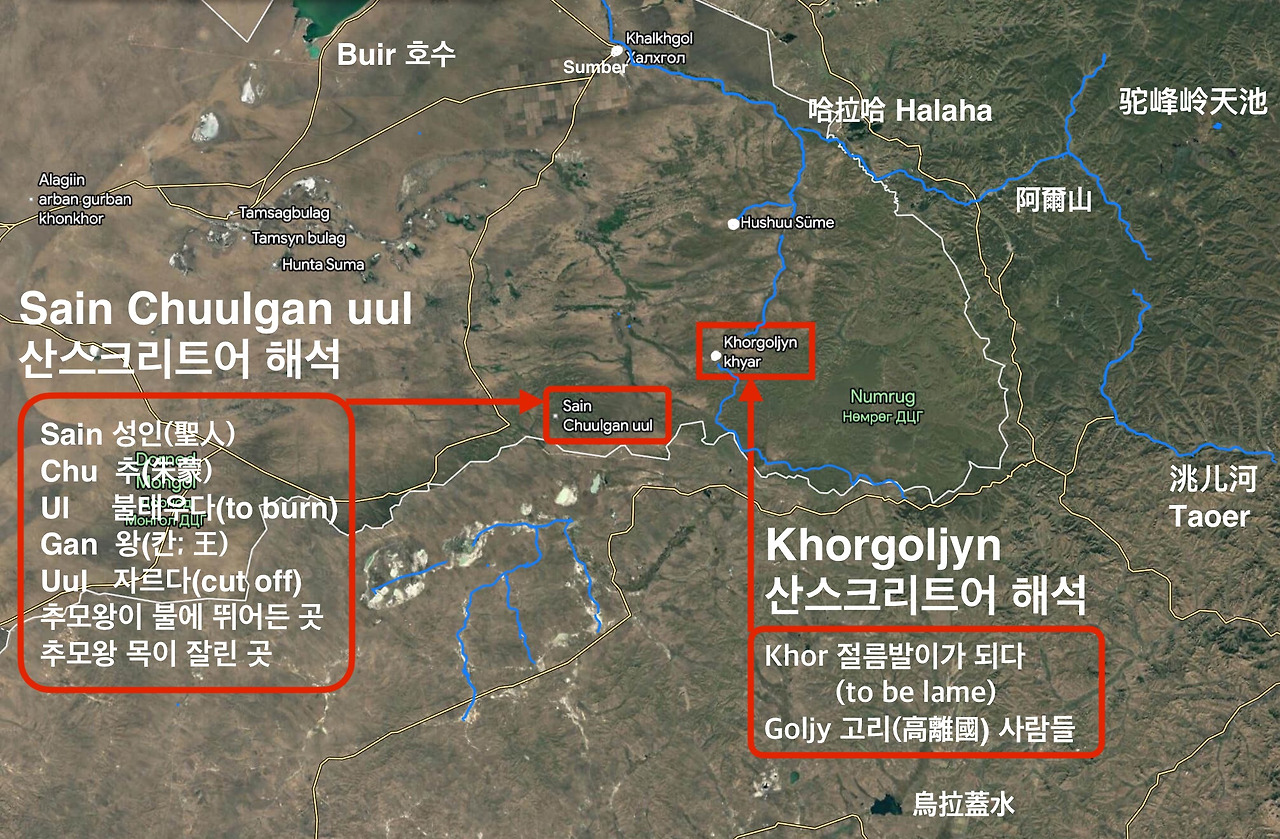 케를렌(Kerlen) 강 중류지역에 있던 탁리국(橐離國)이 계속된 기후 변화와 그로 인한 건조화(乾燥化)로 차무역로(茶貿易路) 관리권(管理權)및 가축(家畜)등 기반(基盤)을 모두 잃고 남하(南下)해 세운 고리국(高離國)은 지금의 코르고린(Khorgoljin)에 있었는데 그 지역은 동호(東胡)의 오환(烏丸)이 지배하는 곳이었다. 코르고린이란 지명 자체가 절름발이(Khor)가 된 고리인(goljin)이란 뜻이었다. 코르(Khor)라는 말은 산스크리트어로 절름발이가 되다, 활력을 잃다란 뜻이고 고린(goljin)이란 고리인(高離人)이라는 뜻이었다. 중국 고대음으로 ljie는 지금의 북경음으로 li(리)였다. 그런 코르고린의 서쪽에는 사인(Sain) 추울간(Chuulgan) 우울(uul)이란 곳이 있는데 이곳은 추모왕이 동부여에서 건너온 유리(瑠璃) 일당과 전투하다 자결(自決)한 곳이었다. 산스크리트어로 사인(Sain)은 성인(聖人 Holy one)을, 추(Chu)는 추모왕을, 울(ul)은 불태우다 그리고 간(gan)은 왕위를 상징하는 지팡이를 뜻했다. 그리고 마지막에 있는 우울(uul)은 잘리다(cut off)란 뜻이었다. 사인 추울간 우울(Sain Chuulgan Uul)이라고 몽고인들이 아직도 그곳을 부르는 것을 보면 졸본성에서 암살을 피해 가까스로 도망친 추모왕이 자신을 추적해 온 유리(瑠璃)가 이끄는 군사들과 마지막 전투를 벌이고 스스로 불에 뛰어든 곳이 틀림없었다. 게다가 한(漢) 나라에게 추모왕(鄒牟王)을 확실히 죽였다는 증거를 보여줘야 하는 유리(瑠璃) 일당이 불타는 추모왕의 몸에서 불을 끈 뒤 목을 잘랐다는 것은 지명(地名)의 마지막 부분(uul)에서 유추할 수 있다. 추모왕이 시신(屍身)도 없는 장례(葬禮)를, 자신이 사용하던 옥채찍만 들어간 능(陵)을 갖게 된 연유였다. 황룡(黃龍)을 황실(皇室)의 표식(標式)으로 삼은 것은 한(漢) 나라가 처음이었다.