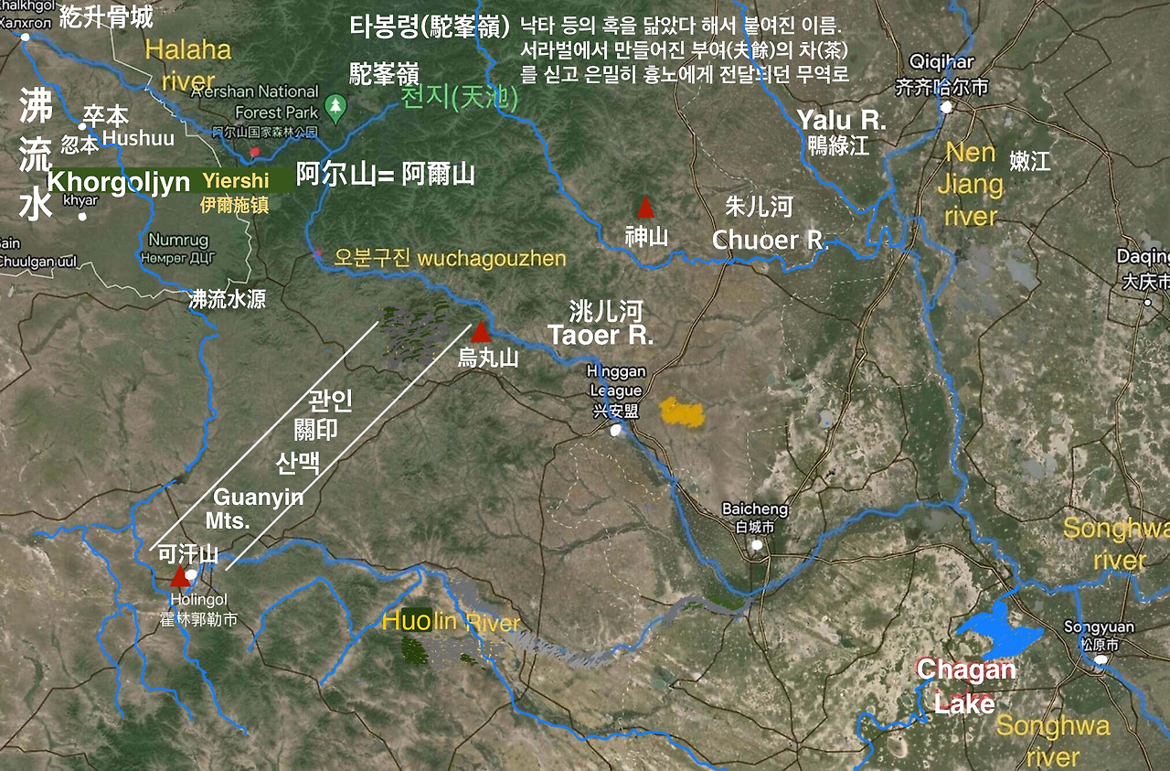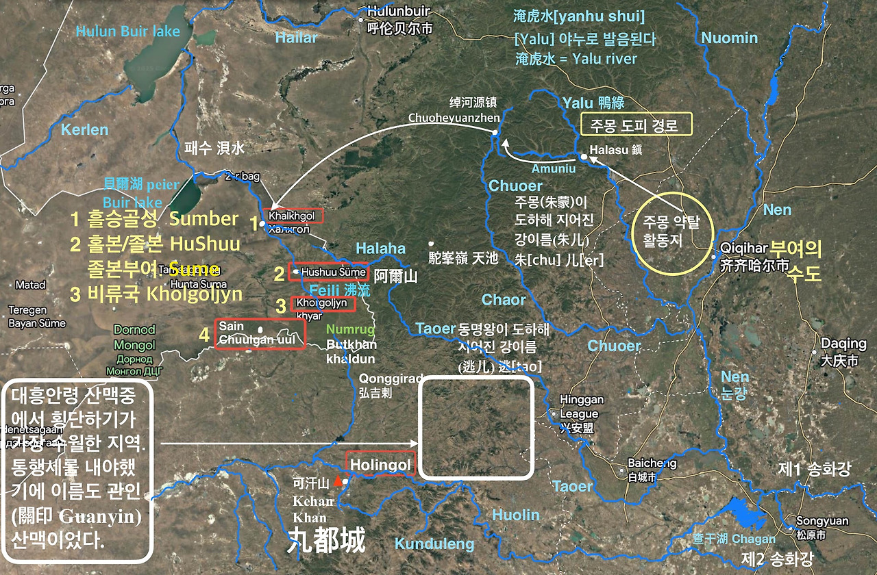 부여(扶餘)가 서라벌의 차(茶)를 흉노에게 전달하는 가장 주된 무역로였기 때문이었다. 산세가 험하지는 않으나 울창한 밀림(密林)이 꾸려진 대흥안령 산맥은 차(茶)를 실은 낙타와 말이 안전하게 다니는 길을 여간해서는 만들어 내기가 쉽지 않은 지역(地域)이었다. 길을 새로 만들라치면 다음 해에는 어김없이 관목(灌木)들이 자라나 낙타(駱駝)들이 다닐 수 없는 길이 되어버리곤 했다. 따라서 대흥안령(大興安嶺) 산맥이 아얼산(阿爾山)을 끝으로 더 이상 밀림을 만들어내지 않는 눔룩 남쪽 지역은 대흥안령 산맥에서 차(茶)를 가득 실은 낙타들이 안전하게 교통 할 수 있는 최적의 지형이었다. 그래서 그 곳에 퍼져있는 나지막한 산들을 카라반들에게 관세(關稅)를 받는 관인산맥(關印山脈)이라 불렀다. 그래서 기원전 210년경 흉노의 묵특선우에게 시라무렌(Xar Moron) 강이 흐르는 석림곽륵(錫林郭勒 Xilingol)) 이남지역에서 축출된 얼굴이 토색(土色)인 동호(東胡)가 북쪽으로 도망가 자리 잡은 지역이 이곳이었고 흉노가 차기(次期) 선우(單于)가 될 태자(太子)에게 좌현왕(左賢王)이라 불린 좌도기왕(左屠耆王) 자리를 주어 다스리게 한 지역이었다. 그런 눔룩(Numrug) 지역을 장악(掌握)한 때가 주몽(朱蒙)의 나이 22세 때였으며 한(漢) 효원제(孝元帝) 건소(建昭) 2년, 신라 시조 혁거세 21년 갑신년(기원전 37년)이었다. 패수(浿水)와 발음이 똑같은 비류수(沸流水)가 흐르는 이 지역은 밀림(密林)이 우거진 눔룩(Numrug)이었고 그 남쪽은 카라반들의 낙타들이 오가는 동서 무역로였다.