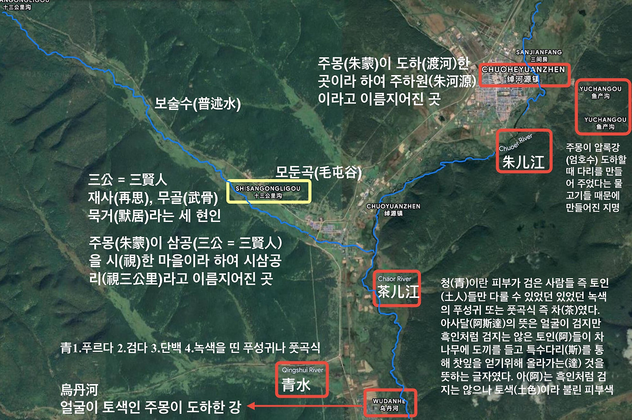 삼국사기에 엄호수(淹虎水)로 기록된 압록강(鴨綠江 Yalu river)의 서쪽에는 차(茶) 아이(儿)를 뜻하는 차올강(茶儿江 Chaoer river)이 압록(Yanhu) 강과 똑같이 남북으로 흐르고 있는데 이 차올강(茶儿江)의 다른 이름은 주올강(朱儿江 Chuoer river)이다. 주몽(朱蒙)이 도하한 강이라 해서 주(朱) 자를 차(茶) 대신 쓴 강이름이다. 주올강(朱儿江)을 구글 지도에서 자세히 살펴보면 시산공리구(ShiSanGongLiGou 十三公里沟)라는 지명(地名)을 발견할 수 있는데 이곳은 오이(烏伊), 마리(摩離), 협보(陜父)와 함께 물고기와 자라의 도움을 얻어 압록강(엄호수)을 도하한 주몽이 재사(再思), 무골(武骨), 묵거(默居)라는 세명의 현인(賢人)을 만났다는 보술수(普述水)라는 강이 흐르는 모둔곡(毛屯谷)이다. 지금은 주몽(朱蒙)이 세명의 현인(賢人)을 만난 곳이라는 사실은 기억조차 못하기에 아무 의미 없는 열 십(十) 자를 썼지만 그러나 원래는 주몽(朱蒙)이 세명의 현인(賢人)을 만났다는 의미의 시(視) 또는 능력을 확인했다는 의미의 시(試) 자였다. 삼국사기에서도 주몽(朱蒙)이 그들에게 성(姓)과 이름이 무엇인지 어떤 사람들인지 물었다고(朱蒙問曰 子等何許人也 何姓何名乎) 기록해 놓고 있다. 이렇게 세 현인(賢人) 즉 삼공(三公)을 지금의 주올강(朱儿江 Chuoer river)인 보술수(普述水) 강변에 있는 지금의 십삼공리구(十三公里沟)인 모둔곡(毛屯谷)에서 만난 이후 주몽(朱蒙)은 그들과 함께 더 서쪽으로 나아가서 삼국사기(三國史記)에서 기록한 졸본천(卒本川)에 이르게 되었다. 위서(魏書)에는 흘승골성(紇升骨城)에 다다랐다고 되어있다고 또한 삼국사기(三國史記)는 전했다.