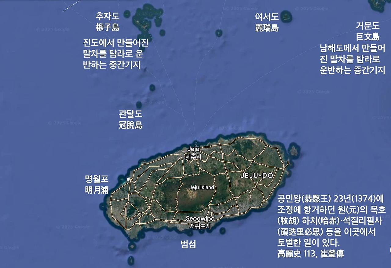 개전 초기 척후대(斥候隊)로 먼저 11척의 배에 나눠 타고 탐라(耽羅)의 서북부에 위치한 명월포(明月浦)로 상륙한 고려 병사들을 몰살시킬 정도로 강한 전투력을 과시했던 3천 명의 목호(牧胡) 기마병(騎馬兵)들은 결국 자신들의 총인구 2만보다 많은 고려군 본진(本陣)과 여러 번 접전(接戰) 한 후에는 후퇴하여 범섬이라 불리는 서귀포 앞바다에 떠있는 사방이 절벽인 섬으로 후퇴해 농성(籠城)에 들어갔다. 하루라도 빨리 목호(牧胡) 반란군을 진압해 탐라를 장악하여 신돈(辛旽)의 밀양(密陽)에서 일본 찻잎(茶葉)을 가공해 만든 말차(末茶)를 유럽의 푸거(Fugger 福建)와 연결된 복건성(福建省)의 천주항(泉州港)으로 보내는 해상 무역로(海上貿易路)를 완성하고 개경으로 복귀해 심각한 암살 위협에 시달리는 공민왕(恭愍王)을 지켜야 하는 최영(崔瑩)에게 범섬으로 들어가 농성을 하는 목호군(牧胡軍)은 눈의 가시였다. 한 명의 군사가 만 명의 적군을 막을 수 있다는 범섬의 유일한 출입로는 촉(蜀) 나라 검문각(劍門閣)처럼 방비되어 있었다. 이때 깎아지른 주상절리(柱狀節理)로 이뤄진 범섬으로 고려 군사들을 올려 보낸 건 말(馬)이 아니라 연(鳶)이었다. 캄캄한 밤 범섬 가까운 바다에 띄운 배 위에서 큰 방패연들을 줄줄이 엮은 후 제주의 강한 바닷바람에 띄우고 일정한 간격으로 뭉뚝한 매듭들을 가지도록 꼰 두꺼운 동아줄 하나를 그 띄어진 연(鳶)들에 연결된 연실에 묶어 꼬리처럼 날아오르게 했다. 방패연(防牌鳶)들이 밤섬 절벽 위로 지나가는 순간 연(鳶)들을 범섬의 정상 지역에 있는 나무들 위로 떨어지게 했다. 떨어지기 전 연(鳶)들을 연(鳶) 싸움할 때처럼 서로 얽히게 해 연줄은 물론 달고 간 매듭 많은 동아줄들도 얽힌 채로 범섬의 절벽 위 나무들에 떨어뜨려 나뭇가지들에 걸리게 했다. 범섬 위 나무들에 떨어진 연(鳶)들에 연결되어 나무 가지들에 걸린 줄들을 조심스럽게 잡아당겨 나무들에 매듭들이 단단히 걸리게 한 다음 그 줄들을 이용해 병사 하나를 절벽을 타고 올라가게 했다. 범섬 위 나무들에 얽힌 연줄들을 이용해 절벽에 올라선 병사는 몸에 감고 간 튼튼한 굵은 동아줄을 풀어 나무에 단단히 묶고 동아줄의 다른 쪽 끝을 절벽 아래로 던졌고 그 줄을 통해 다른 동아줄을 몸에 감은 병사들이 속속 절벽 위로 소리 없이 올라와 자신들이 가져온 동아줄을 나무에 묶고 그 끝을 다시 절벽 아래로 던졌다. 결국 범섬 정상위로 올라온 고려군이 유일한 출입로만을 방비하며 휴식을 취하던 목호군(牧胡軍)을 짓이긴 건 당연했다. 그러나 목호군(牧胡軍)의 완강한 저항으로 예정보다 오래 탐라에 머문 최영(崔瑩)은 결국 철군(撤軍) 길에 태풍을 만나 개경으로 복귀하지 못하고 탐라(耽羅)에 발이 묶여 버렸고 그 사이 개경의 공민왕은 염초(焰硝)를 갖고 왔다며 벽란도(碧瀾渡)에 정박한 명나라 선박에 숨어 있다 한밤중 튀어나온 실크로드 상방(商幫)이 고용(雇傭)한 최정예 자객단(刺客團)에 의해 암살되었다. 탐라 주민들에 대한 무자비한 살육이 뒤따랐던 건... 공민왕이 사라진 고려에 최영은 그저 늙은 한 명의 장수에 불과했고 백성들의 자발적 단결을 끌어내던 공민왕을 대신할 수 있는 지도력(指導力)은 이제 고려에 없었다. 실크로드 상방(商幫)의 사주(使嗾)를 받아 1361년 홍건적(紅巾賊)을 이끌고 이미 개경을 점령한 바 있었던 명(明) 나라 태조(太祖) 주원장(朱元璋)의 턱없는 공갈(恐喝) 협박(脅迫)에 맞서는 사람은 이제 소수의 충신들밖에 없었다. 일본의 찻잎을 수입해 비밀리에 말차(末茶)로 가공한 후 중국 복건성(福建省)으로 보내 유럽으로 수출하는 해상무역로를 기획, 개척하고 말차(末茶) 산업 진흥을 위해 말차(末茶) 제조(製造)에는 초은(樵隱) 이인복을, 말차 수송(輸送)에는 목은(牧隱) 이색을, 일본 찻잎 조달과 해운(海運)에는 포은(圃隱) 정몽주를 비밀리에 포진시켜 후일 도자기 분야를 책임진 도은(陶隱) 이숭인과 야금(冶金)을 책임진 야은(冶隱) 길재까지 오은(五隱) 체제를 엮어낸 익제(益齋) 이제현(李齊賢)은 1367년에 이미 노환으로 세상을 떠났다. 말차(末茶) 제조(製造)에 필요한 모든 시설과 설비를 처음부터 비밀리에 추진해 자기 고향에 완비하고 말차(末茶)를 생산하던 신돈(辛旽)은 1371년 진즉 실각당해 유배(流配) 길에 죽었다. 신돈(辛旽) 이후 어쩔 수 없이 공개적으로 나서서 말차(末茶) 제조(製造)와 수출을 지휘했던 초은(樵隱) 이인복(李仁復)은 1374년 공민왕과 함께 암살되었다. 전 세계 패권(霸權)을 장악한 실크로드 상방(商幫)이 가장 경계하는 일본 찻잎으로 만든 차(茶)와 해상무역을 동시에 했기에 비밀스러울 수밖에 없었던 그들은 그래서 은(隱) 자로 운을 맞춘 호(號)를 지어 그들의 결속을 나타냈다. 오은(五隱) 중 이인복과 정몽주 그리고 이숭인은 암살되었다.