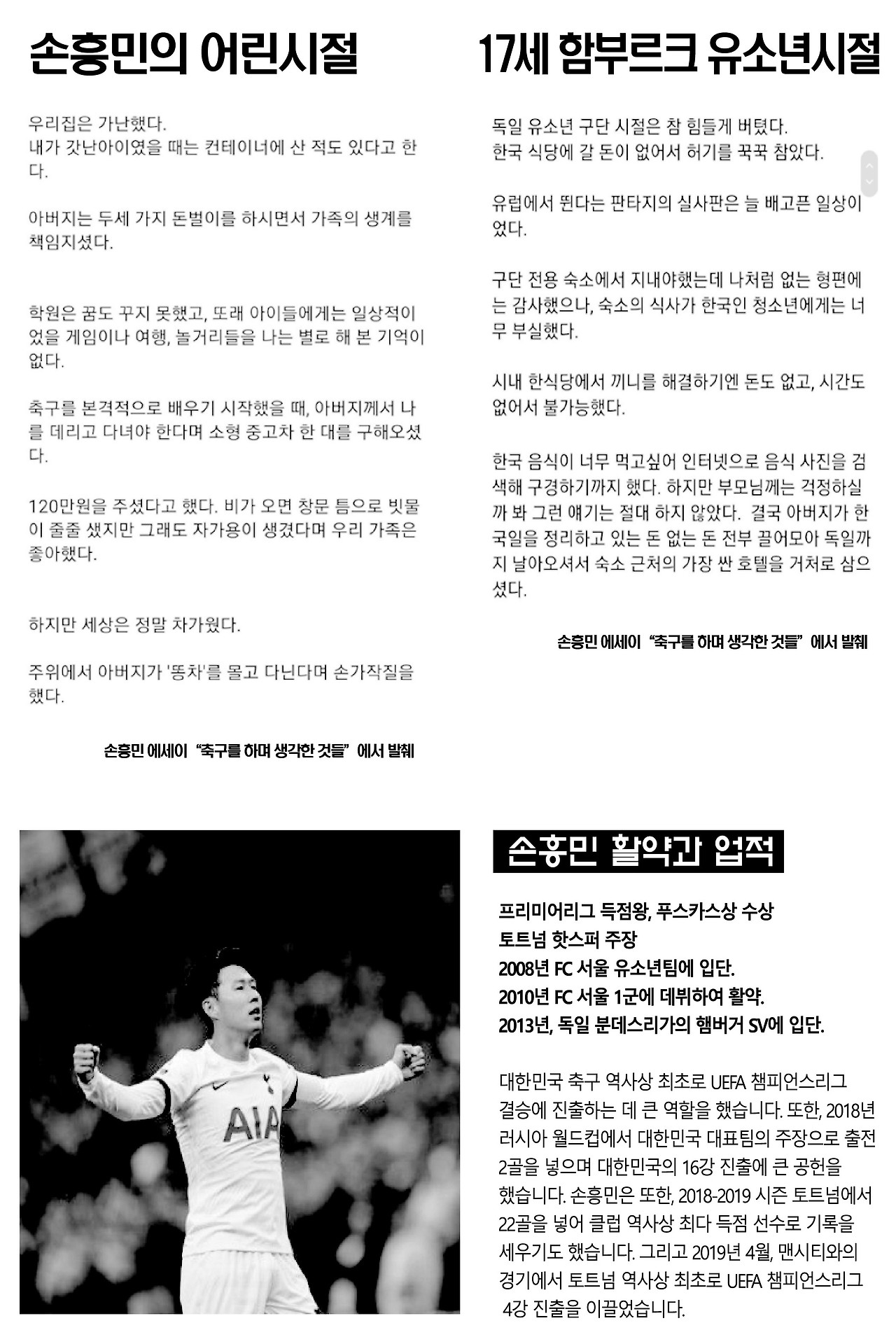 딸의 숙제를 하면서 알게 된 것은 손흥민은 생각보다 훨씬 훌륭한 선수이었다. 그의 어려웠던 가정사는 전혀 몰랐다. "축구 좀 하는 사람"정도만 알고 있었는데 인간적으로 존경스럽다. 나도 꿈을 포기하지 말아야겠다.