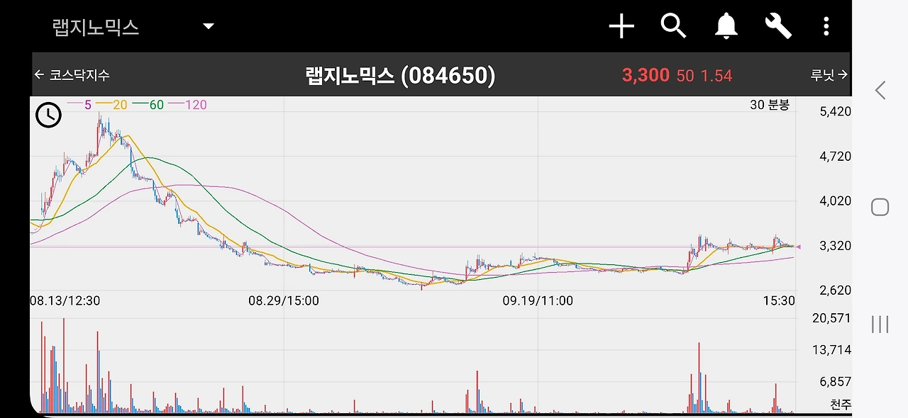지난번 글에 올렸던 종목은 랩지노믹스다. 10월 8일 화요일 종가 3,300원. 글 작성날짜는 10월 10일. 10월 16일 어제 종가는 3,515원이다. 4일 간 하락 후 어제 17% 급등했다. 장중 최고가는 24% 상승. 글 작성 당시 1-2주 안에 주가가 오르기를 희망했는데 다행히 상승을 했다.