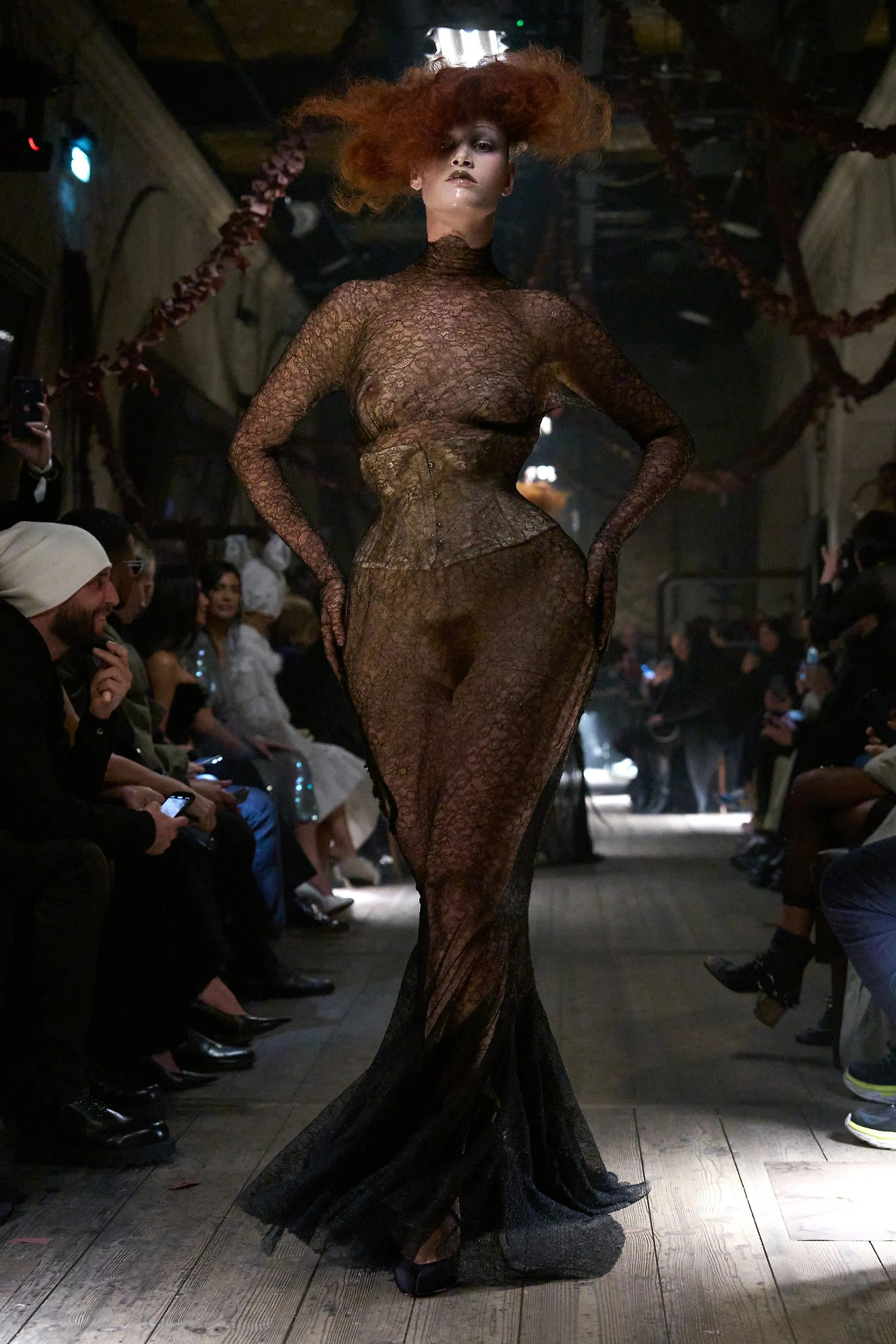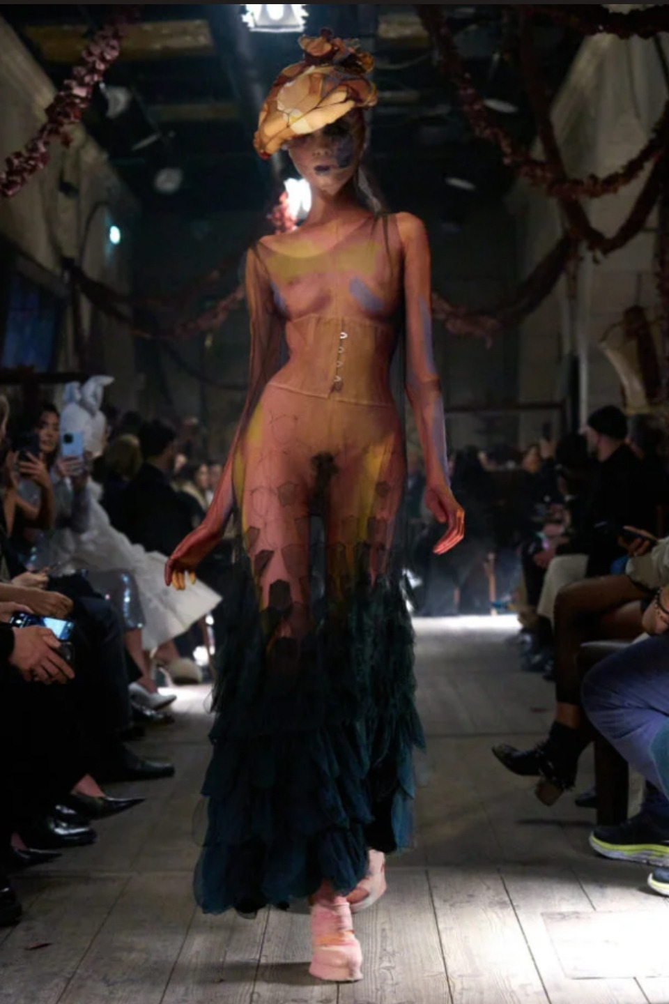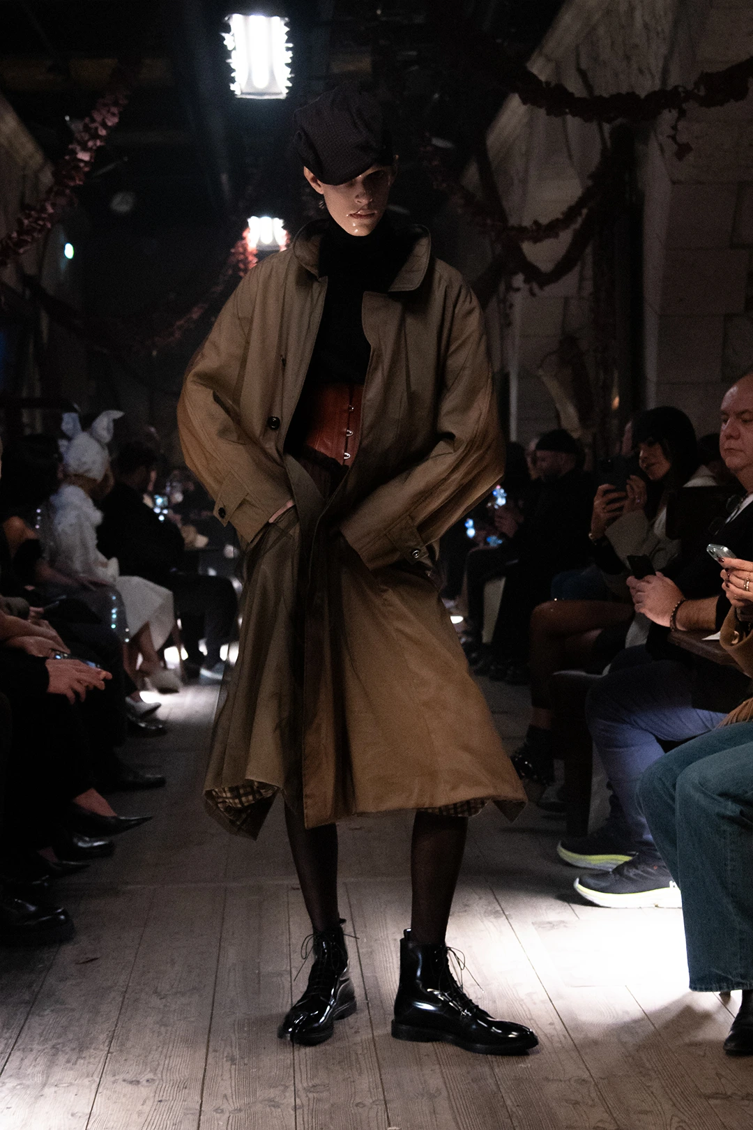 이번 2024 메종 마르지엘라 아티즈널 컬렉션에 새로운 장르를 선보였다고 해도 과언이 아닌 수장 존 갈리아노(John Galliano). 관절 인형의 얼굴 재현한 듯한 모델들의 메이크업과 섬뜩하고도 극단적인 코르셋, 속옷과 에로틱한 레이스 드레스와 뒤틀린 듯한 코트까지, 의상과 메이크업만으로도 충분히 그의 파격적인 시도가 엿보였다. 거기에 더불어 알렉상드르 3세 다리 아래 1920-30년대 파리의 술집을 재현해 낸 듯한 무대와 그 위를 위태롭게 걷는 모델의 모습이 더 해졌을 땐 마치 한 편의 연극을 보는 듯하기도 했다.