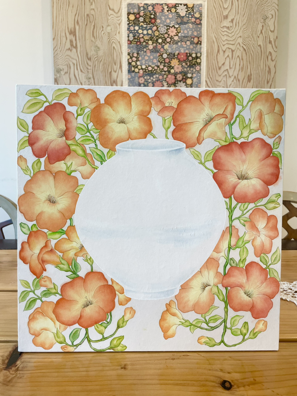 그야말로 한 여름 뜨거운 햇빛 같기도 하고, 동시에 왠지 시원함도 느껴지는 이 꽃을 그리고 싶었다. 능소화의 눈부신 색이 돋보이도록 하얀 달항아리와 같이 그렸다.