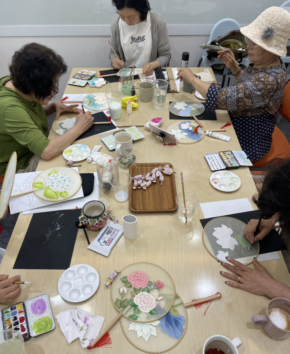 그 여름에 맞는 계절 수업으로 아이들은 캔버스에 바다를 그리고, 성인들은 부채에 그림을 그린다.