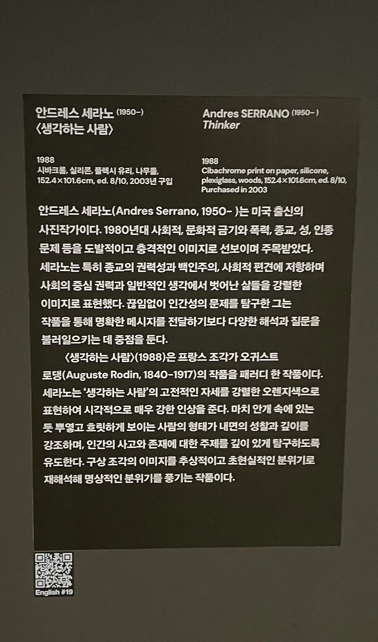 오랜만에 보게 된 세라노의 작품. 꽤 오래 전 1999년 국제갤러리에서 처음 본 세라노 작품의 충격이 떠올랐다. 단순히 금기를 깬 작품을 선보여서라기 보다 작품에 대한 설명이 없다면, 약간의 의구심을 품고 바라볼 성스러움이 얼마나 얄팍한 것인지에 대한 생각이 그 당시 작품의 보여지는 깊이에 대해 고민하던 내게 많은 생각을 줬다. ( 논쟁적인 < Piss Christ>)
