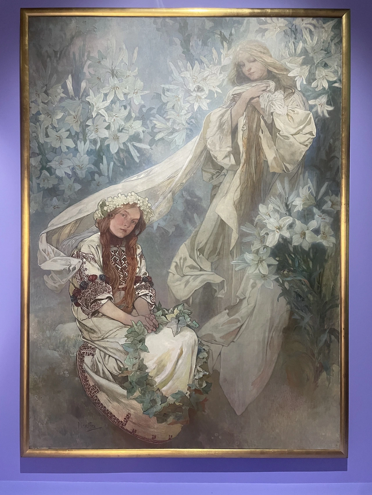 순결의 상징 안 백합에 둘러싸인 성모의 영적인 모습과 슬라브 민속의상을 입은 실재적 소녀를 대비하여 소녀에게 성모의 영적인 힘이 축복을 내리는 모습으로 표현되었다. 한눈에도 아름다운 작품이지만, 이 작품을 기점으로 나도 내가 알던 알폰스 무하에 더한 또 다른 무하를 만나게 되었다.