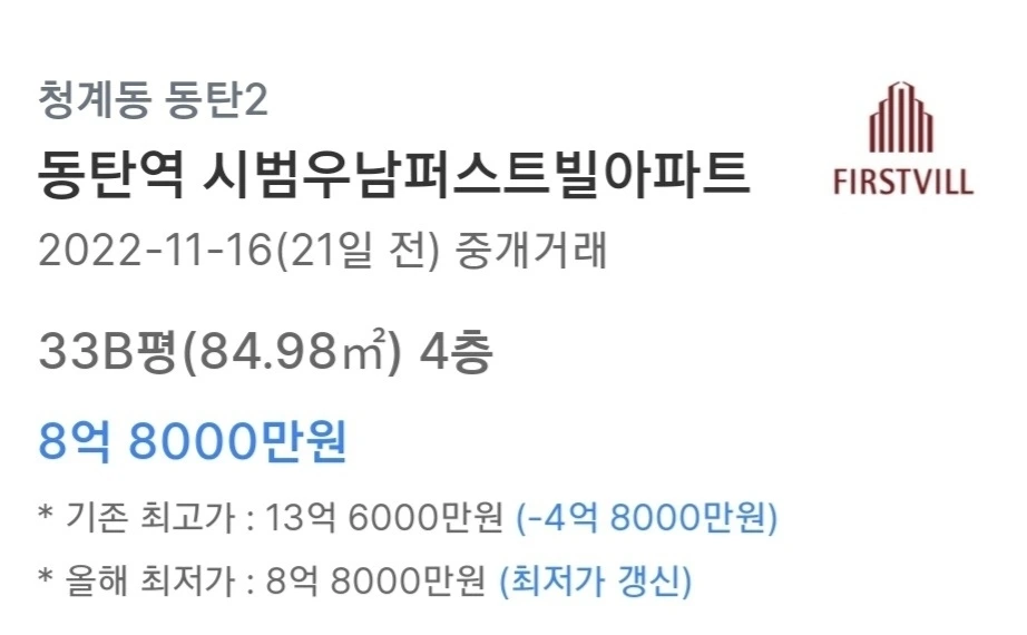 동탄 대장 아파트가 13억 가던 게 오늘(2022.12.7) 실거래 8억 8천으로 신고됐다. 오늘 기준 21일 전 거래이고 오늘 신고된 것이다. 누군가는 8억 8천주고 산거다.