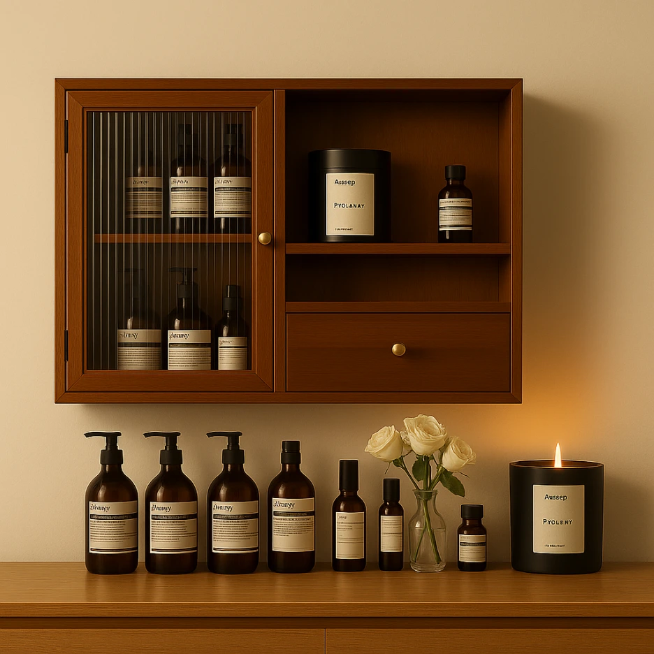 우드 톤, 브라운 글라스, 미니멀한 라벨.