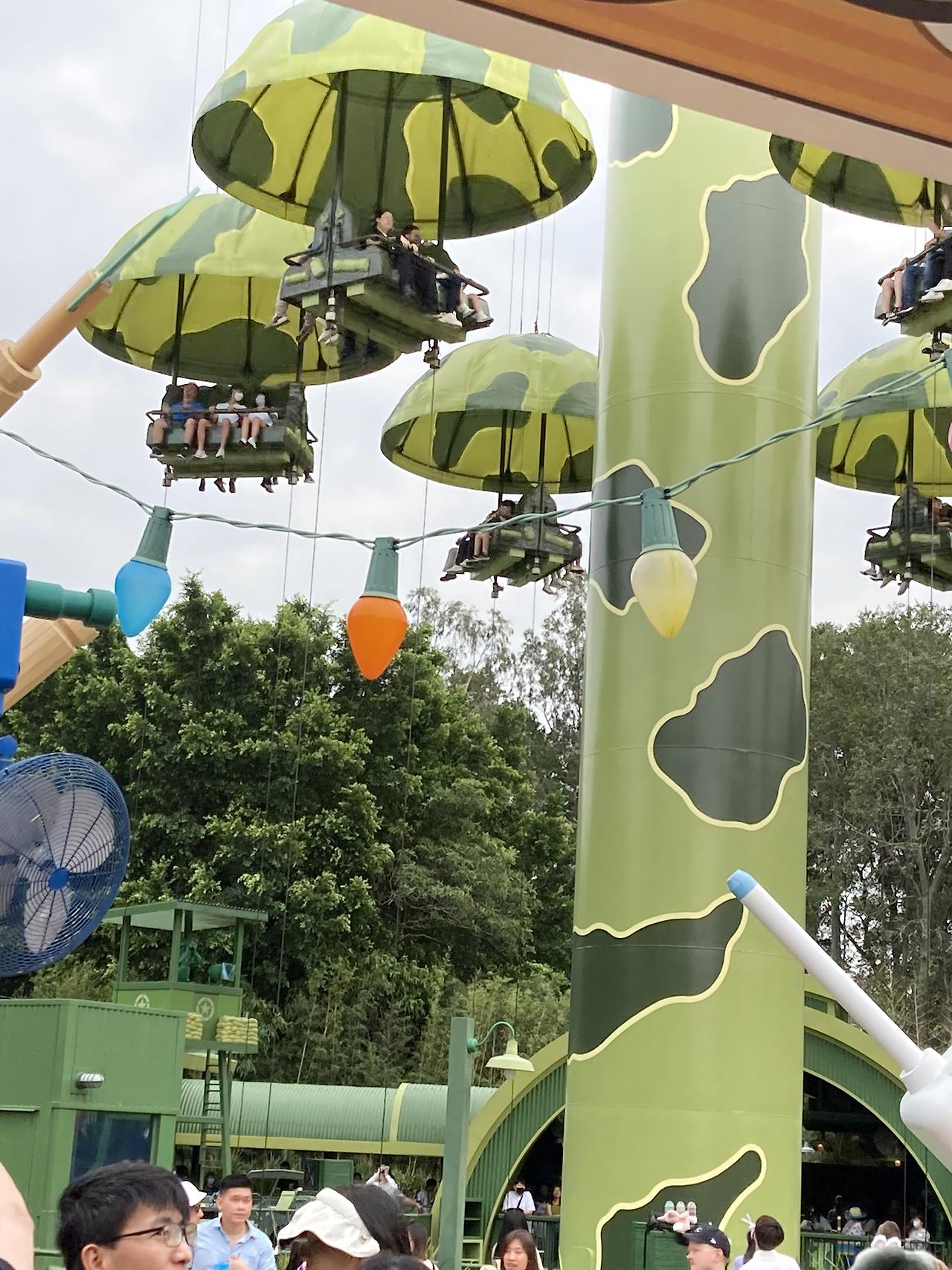 ‘rc 레이서’ 다음으로 스릴 있는 ‘토이솔저 낙하산 드롭’은 오후에는 대기줄이 60분까지 길어졌다. 하지만 홍콩인 친구덕에 알게 된 팁! 파트너와 같은 자리에 타지 않고 ‘남은 자리 혼자 앉기’가 가능하다.
