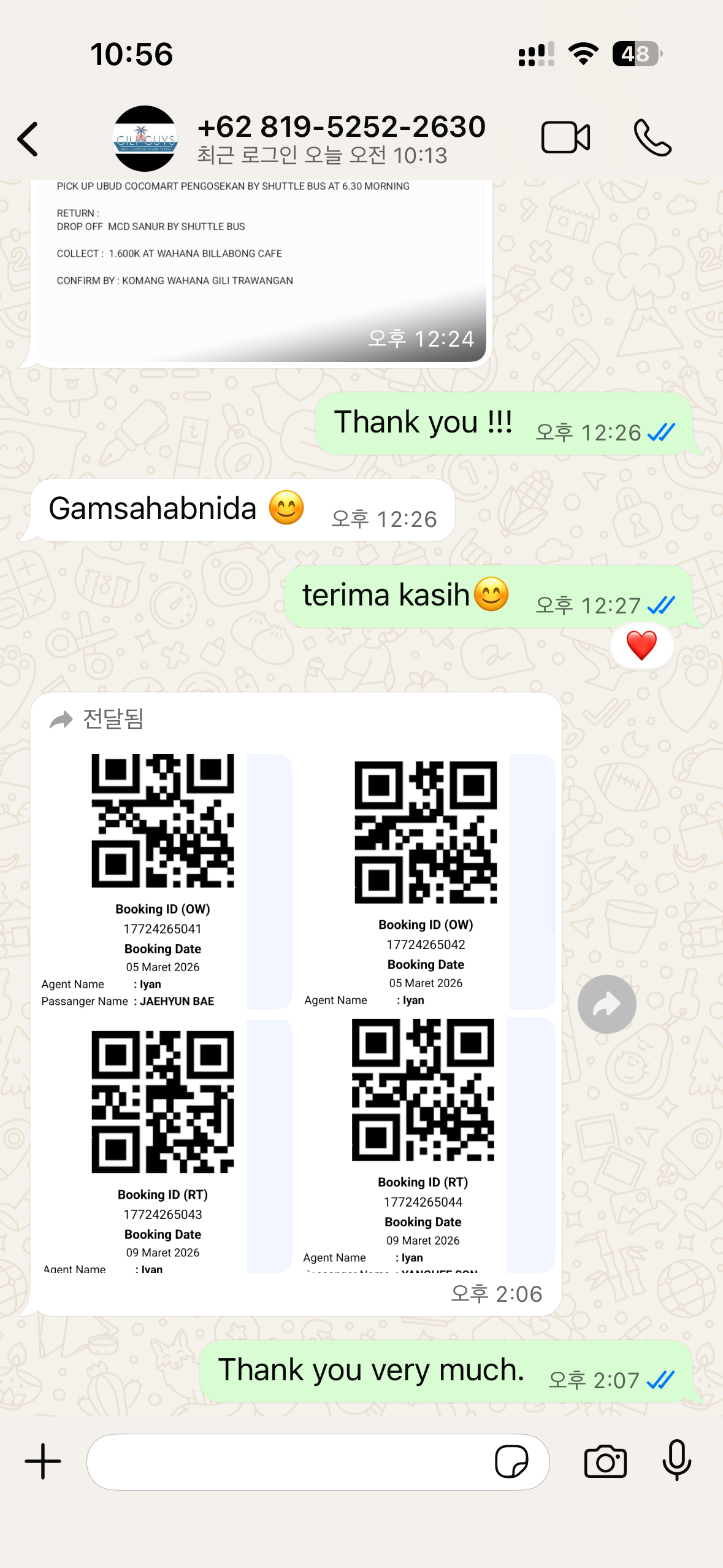 보통 이곳 현지 여행사의 시스템은 이렇다. 왓츠앱으로 비용과 픽업 셔틀 요금을 문의한 뒤 승선 QR코드를 받는다. 그리고 배를 타기 하루 전, 픽업 담당자가 모이는 장소와 시간을 왓츠앱으로 알려주는 식이다.
