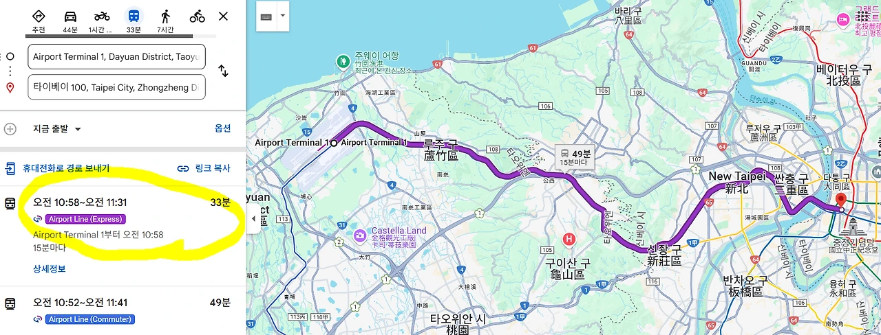 공항터미널 2에서 탑승해 종점인 타이베이역에서 내린다.