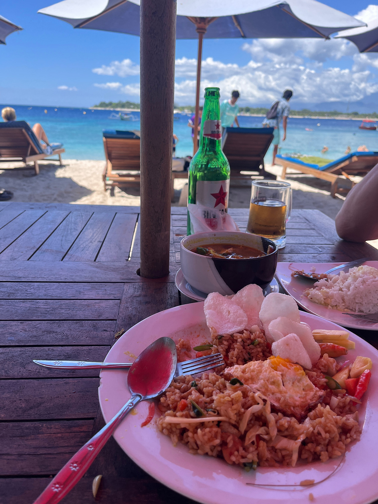 길리에서의 식사는 매 순간이 즐거움이었다. 아침에는 신선한 과일과 함께하는 간단한 팬케이크, 그리고 따뜻한 커피 한 잔으로 여유로운 하루를 시작했다. 스크램블 에크와 토스트로 든든하게 배를 채우기도 했다. 점심에는 푸른 바다가 눈앞에 펼쳐진 해변가에서 나시고랭과 같은 현지 음식을 맛보며 길리에서의 시간을 만끽했다.