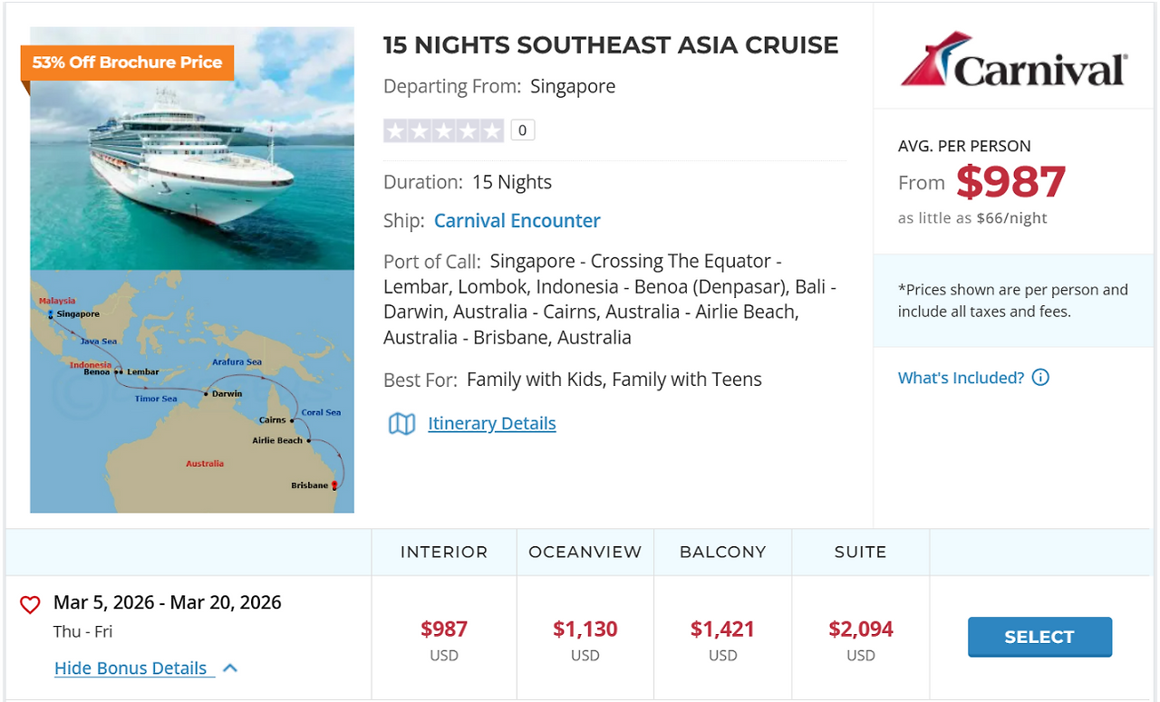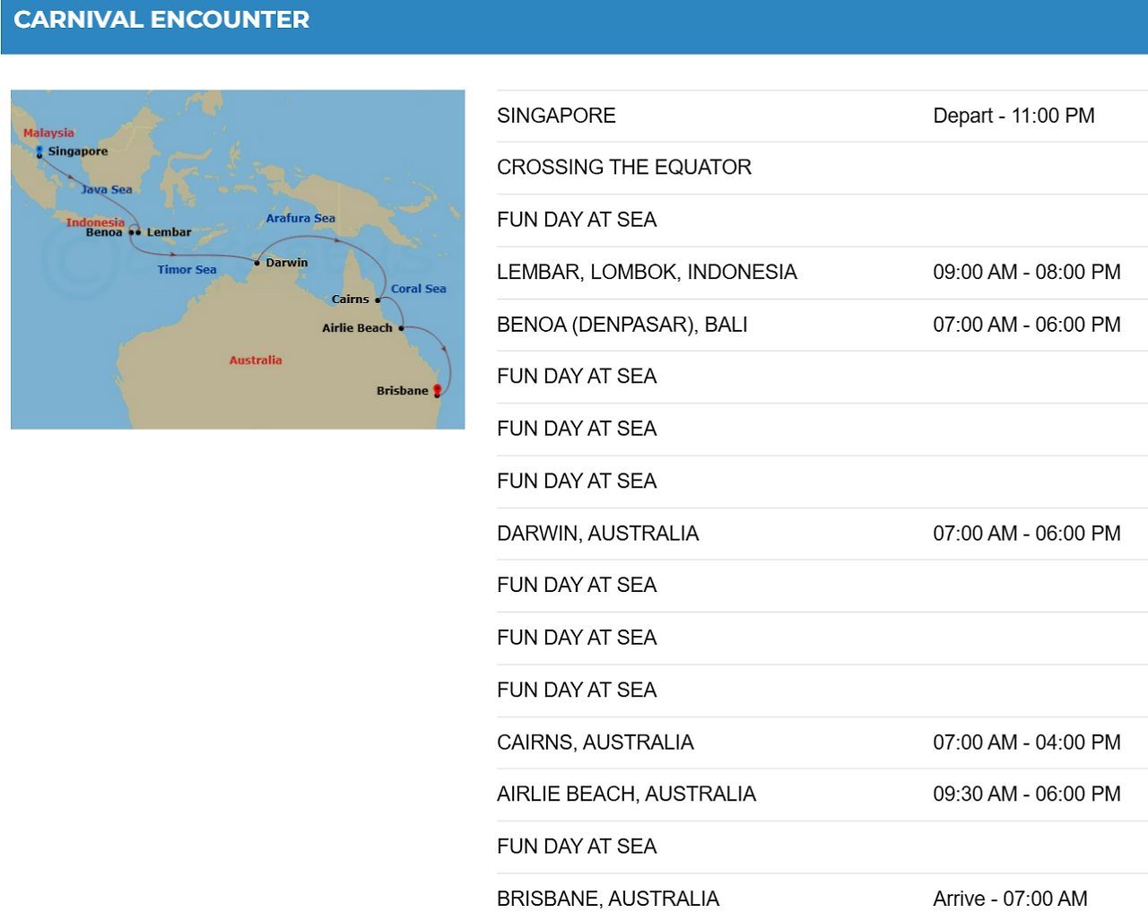 싱가포르의 화려함, 인도네시아의 신비로움, 그리고 호주의 대자연의 웅장함을 한 번에 경험할 수 있는 이 15박 크루즈일정은 분명 잊지 못할 추억이 될 것이다. 7일 이상의 일정에서만 느낄 수 있는 깊이 있는 여유와 다양한 기항지의 매력에 빠져들고 싶다면, 2026년 카니발 인카운터 크루즈를 진지하게 고민해 보자.