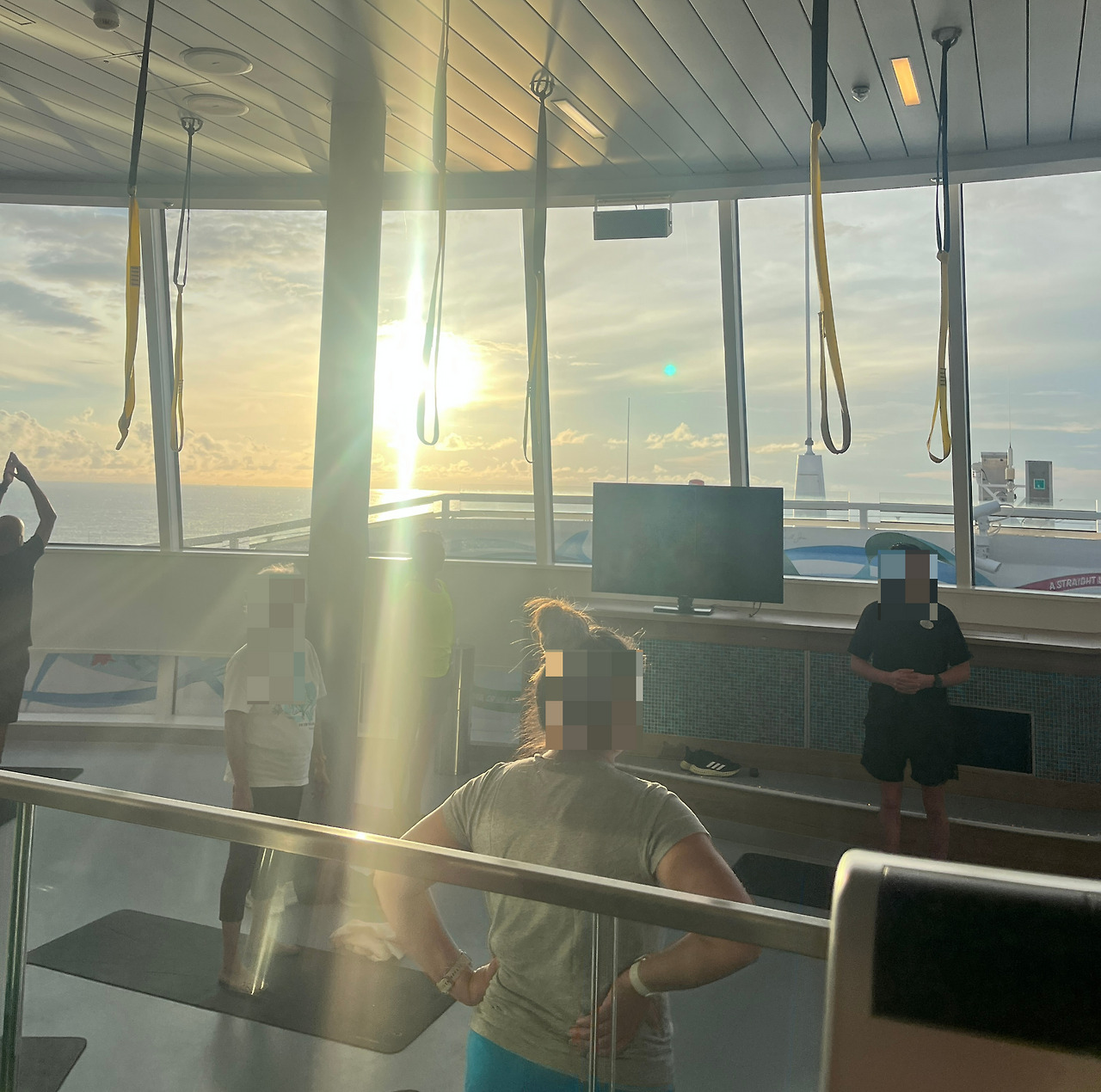 바다 한가운데서 일출을 보며 운동을 하다니~