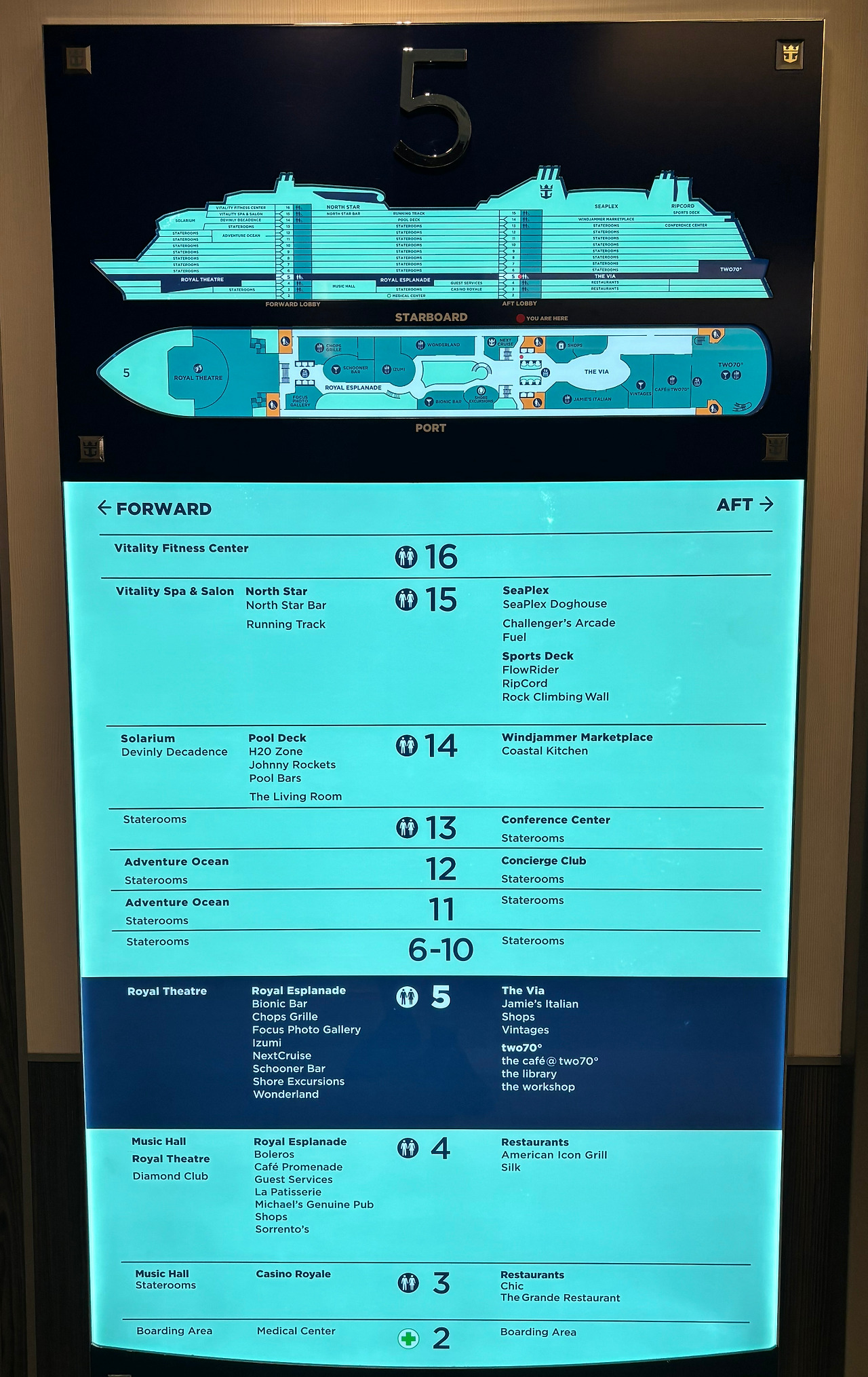 로얄캐리비안 크루즈의 경우 편의시설은 보통 객실이 6층~13층에 위치하고,