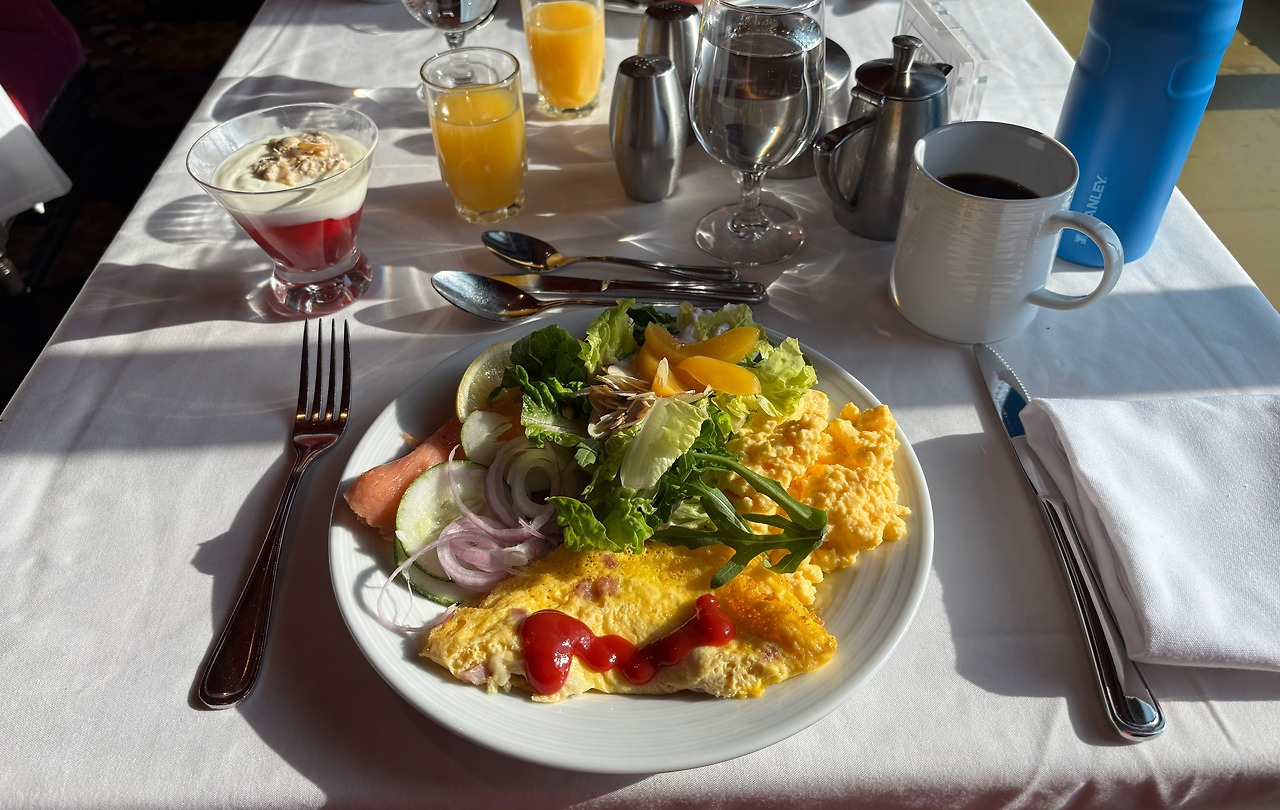 아침에 운동 후 룸에 가서 샤워를 하고, 다이닝에 가서 간단히 아침을 먹는다. 아침에 식사를 할 수 있는 식당은 여러 가지가 있다.
