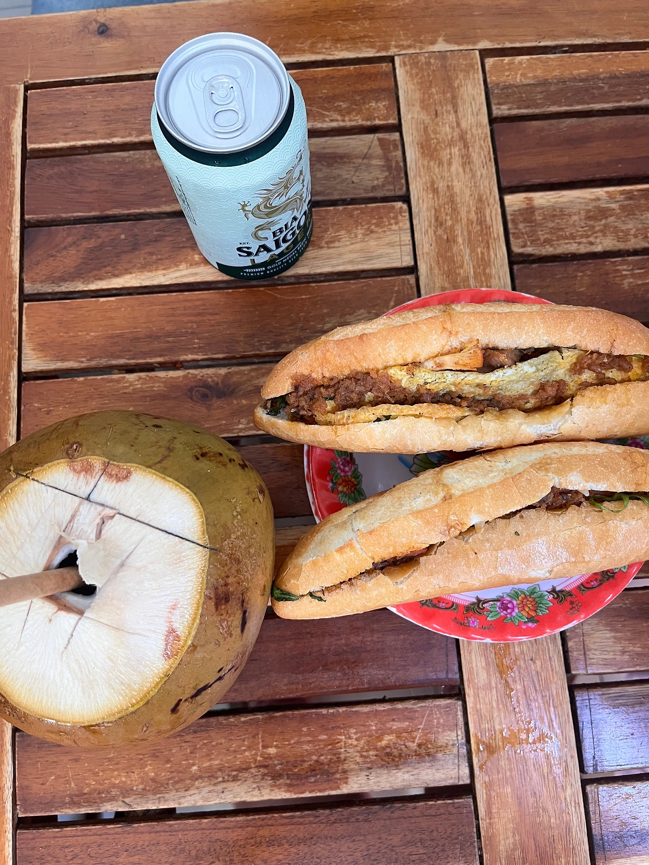 믹스 반미, BBQ반미, 사이공 맥주와 코코넛을 주문한다.