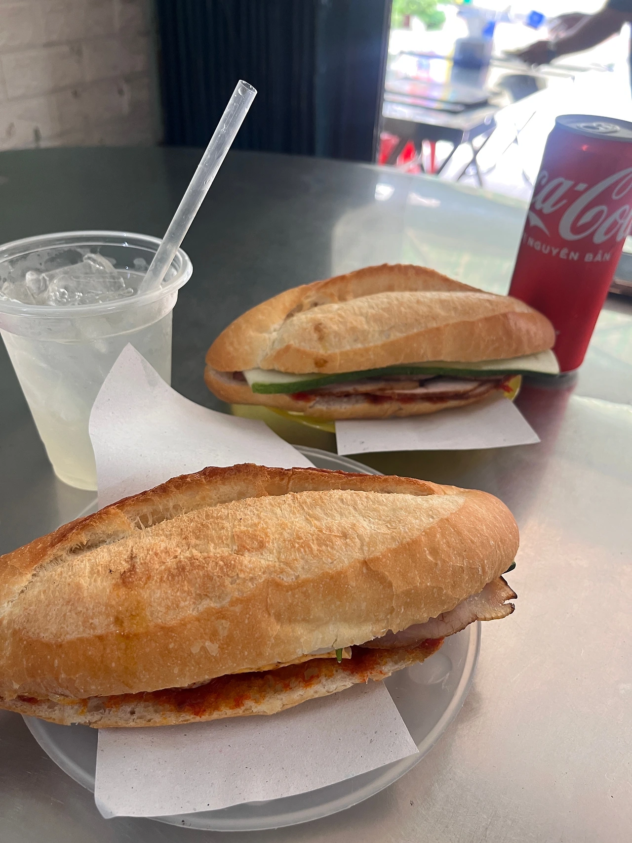 돼지고기 & 계란 반미, 베트남 전통 반미, 콜라, 레몬주스를 주문한다.