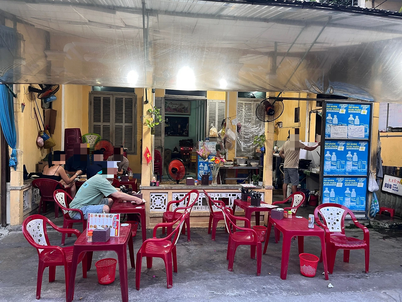 사람들이 많이 다니는 길의 골목에 정착해 빨간 플라스틱 테이블과 의자를 두고 장사를 한다.