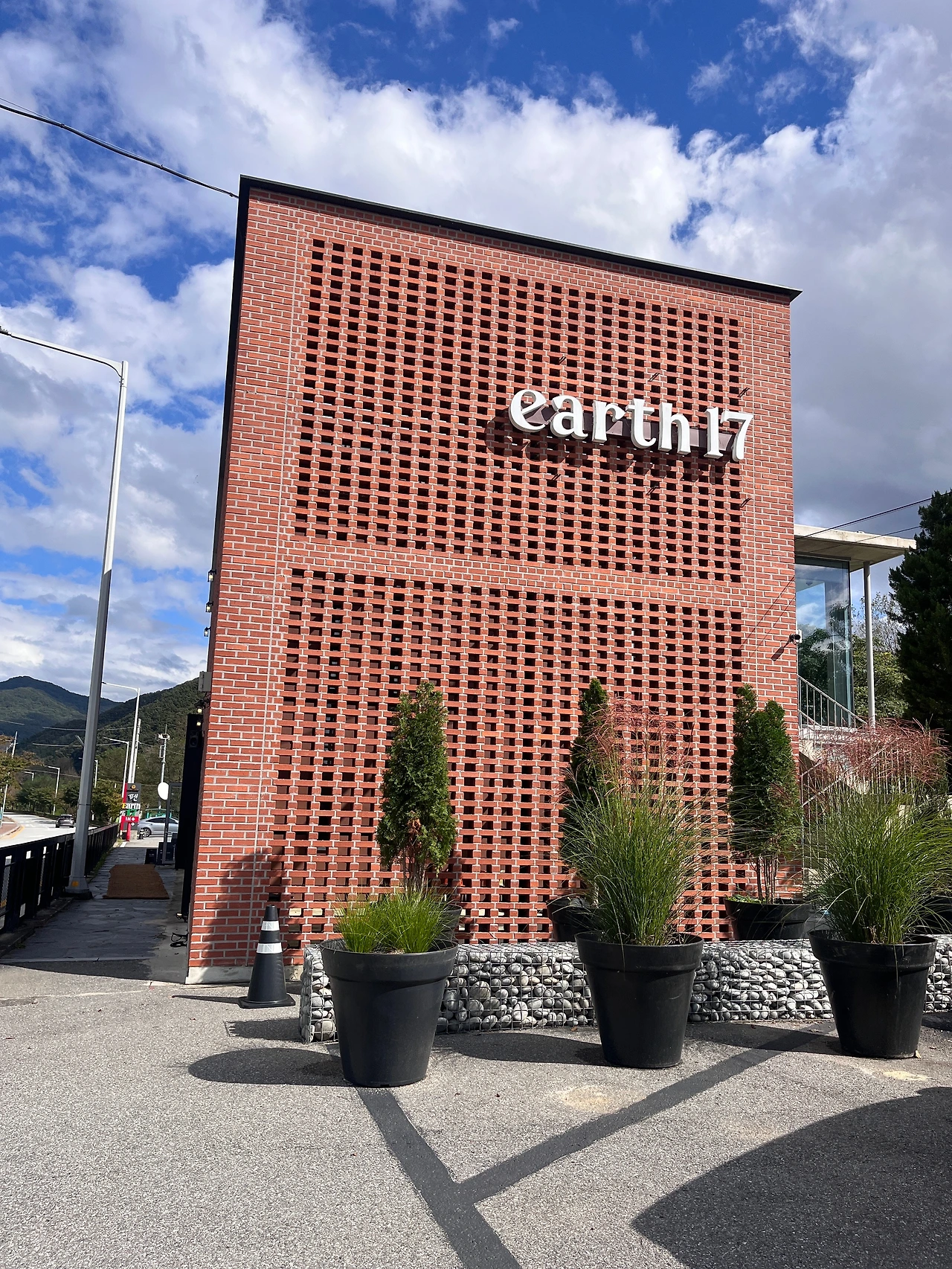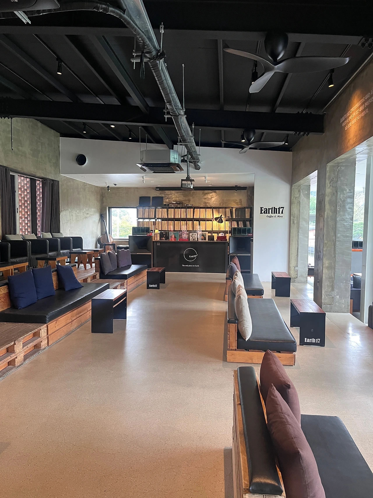 하지만 이번은 음식점 옆으로 소양강 물이 흐르는 강물길에 위치한 ‘Earth 17’이라는 카페로 갔다. 카페 안으로 들어가서 처음 마주하는 풍경은 자연을 잔뜩 품은 모습이다. 카페 앞으로 만들어진 넓은 초록의 공간은 눈을 시원하게 했다. 가짜 잔디이지만, 바닥에 깔려있는 초록 잔디의 모습과 잔디 위에 덩그러니 놓여있는 베드 같은 쿠션, 간결한 테이블과 의자는 오후의 여유로움을 한층 더 편안하게 만들었다. 태양이 가장 강한 낮시간이었기에, 우리는 2층으로 올라갔다. 2층은 음악감상실이라는 이름으로 노키즈존, 정숙을 요한다고 표시되어 있다. 턴테이블에서 흘러나오는 올드팝송은 이런 풍경을 더 평화롭게 만들어 주었다.