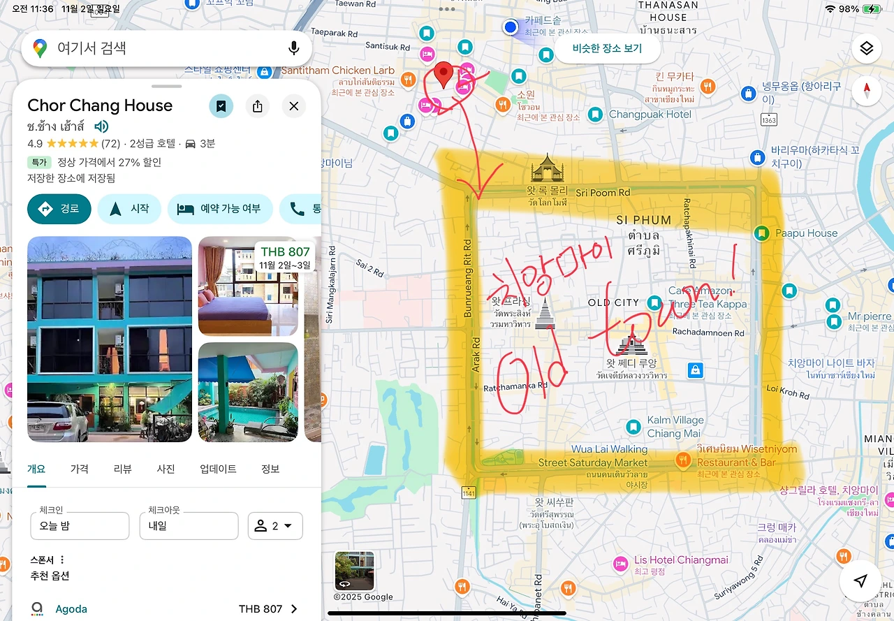 첫날 숙소의 위치는 싼티탐이다. 구글 지도기준으로 치앙마이 올드타운 왼쪽 북쪽 끄트머리 조금 위에 위치한 곳을 첫날 숙소로 잡았다. 숙소의 위치는 적절했다. 올드타운을 걸어가기도 괜찮고, 마야몰과의 거리도 적당하다.