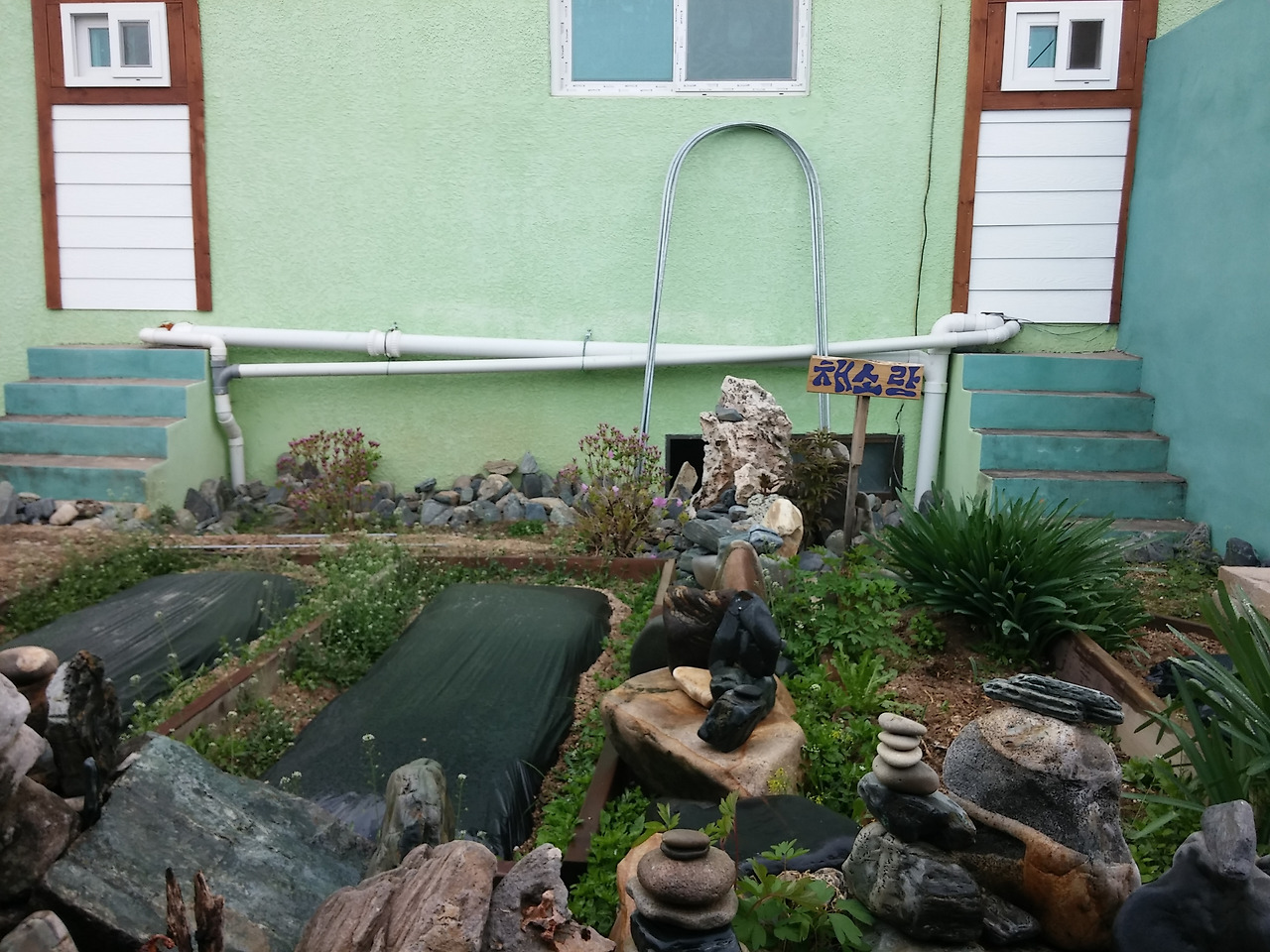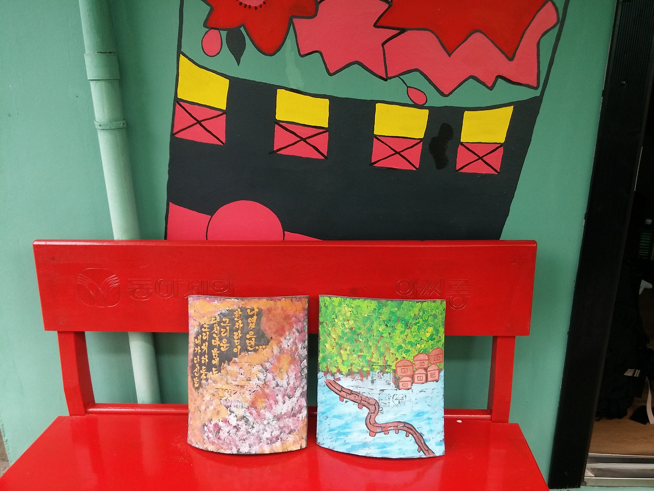 오늘 숙박할 청풍면에는 축제가 한창이다. 피로에 지친 묵직한 몸을 끌며 낮에 먹지 못한 보상심리로 식당을 두리번거리다가 피곤이 밀려와 먼저 숙소를 찾아다녔다. 주택을 개조한 작고 앙증맞은 민박집이 눈에 띄어 들어갔다. 대문을 들어서자 하얀 칠을 한 몽돌이 줄지어 박혀 있다. 진입로인 셈이다. 목제 의자는 빨간색 옷을 입었고, 시와 그림이 어우러진 기왓장이 의자에 앉아 있다. 온통 울긋불긋 원색의 향연이다. 이 집에서는 일상의 도구가 예술품이었다.