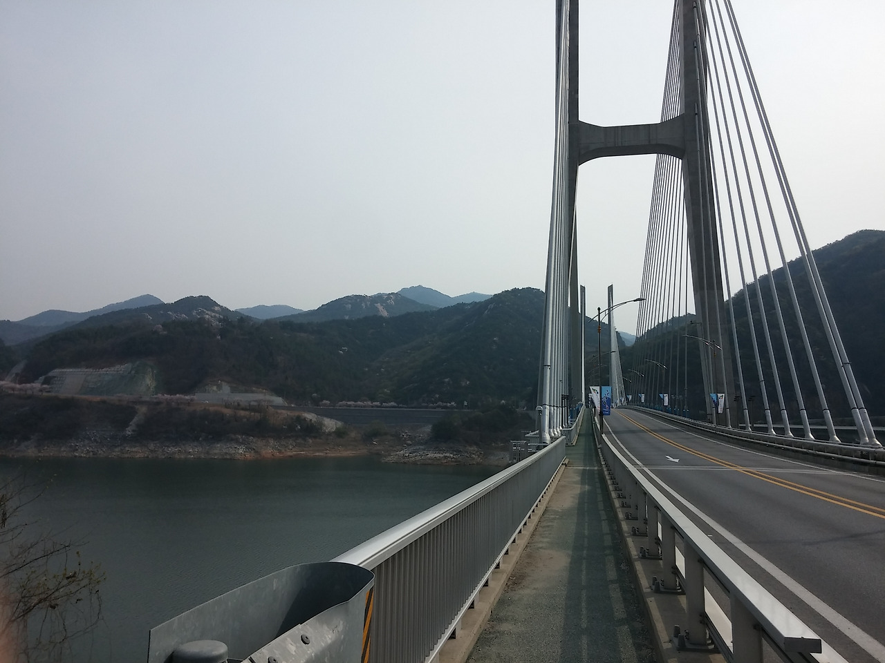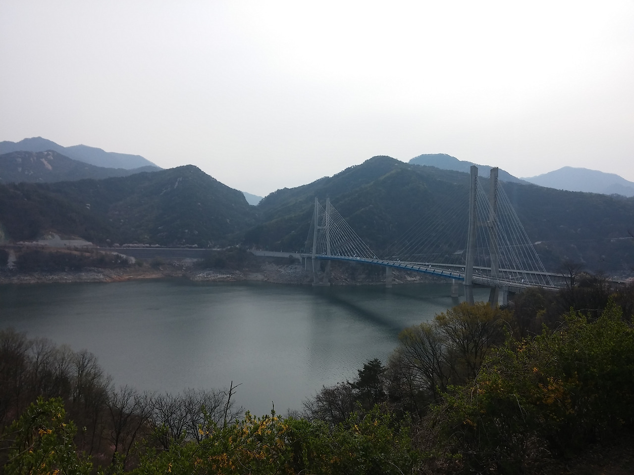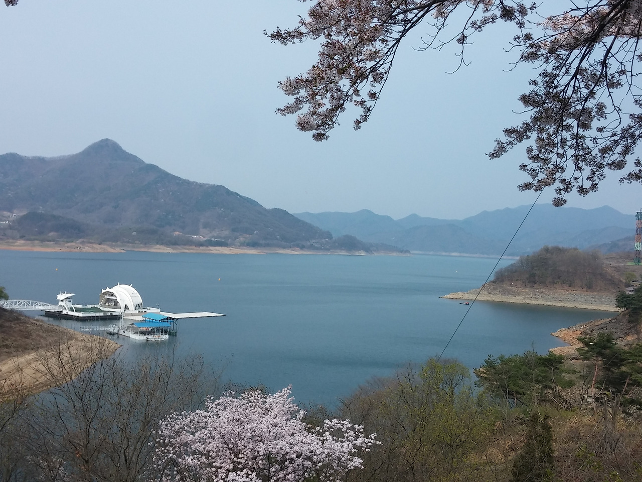 아침의 청풍면은 청풍명월의 고장답게 아름다웠다. 활짝 핀 벚꽃과 청사초롱이 달린 길을 걷는 맛에 어제의 피로가 가신다. 1.2km 사장교(斜張橋)인 청풍대교를 건너기 전 청풍문화재단지가 보여 다가갔다. 충주다목적댐 건설로 인근 24개 마을이 물에 잠겼다.