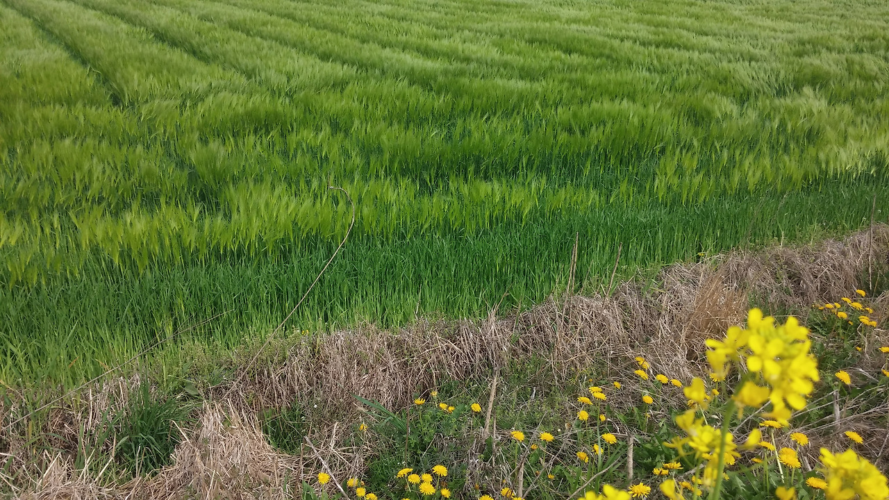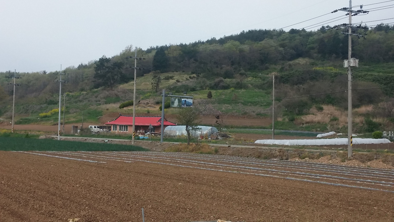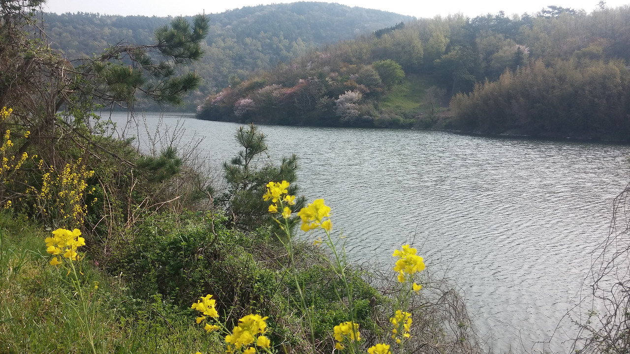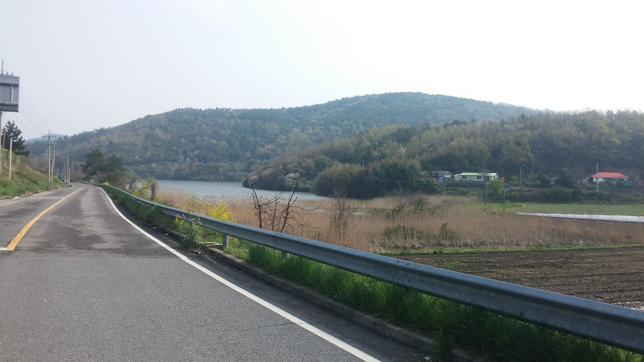 날도 쾌청한 오늘 진도읍을 출발하여 이순신 장군이 왜적을 대파한 울돌목을 건너 해남 땅으로 들어간다. 아침 햇살이 따사롭다. 읍내 4차선 도로를 따라 걷다가 시내를 벗어나서 오른쪽 구도로인 월강로로 들어섰다. 이어 호수인 월가제 옆을 끼고 걷는다. 아침 햇살에 윤슬이 반짝인다. 호수 건너 물과 맞닿은 동산에 붉은 꽃이 만발하다. 호젓한 길이 아름답다. 들녘에는 청보리 물결이 바람에 일렁인다. 저 멀리 빨간색 지붕을 이고 있는 농가 한 채가 산자락에 안겨있다.
