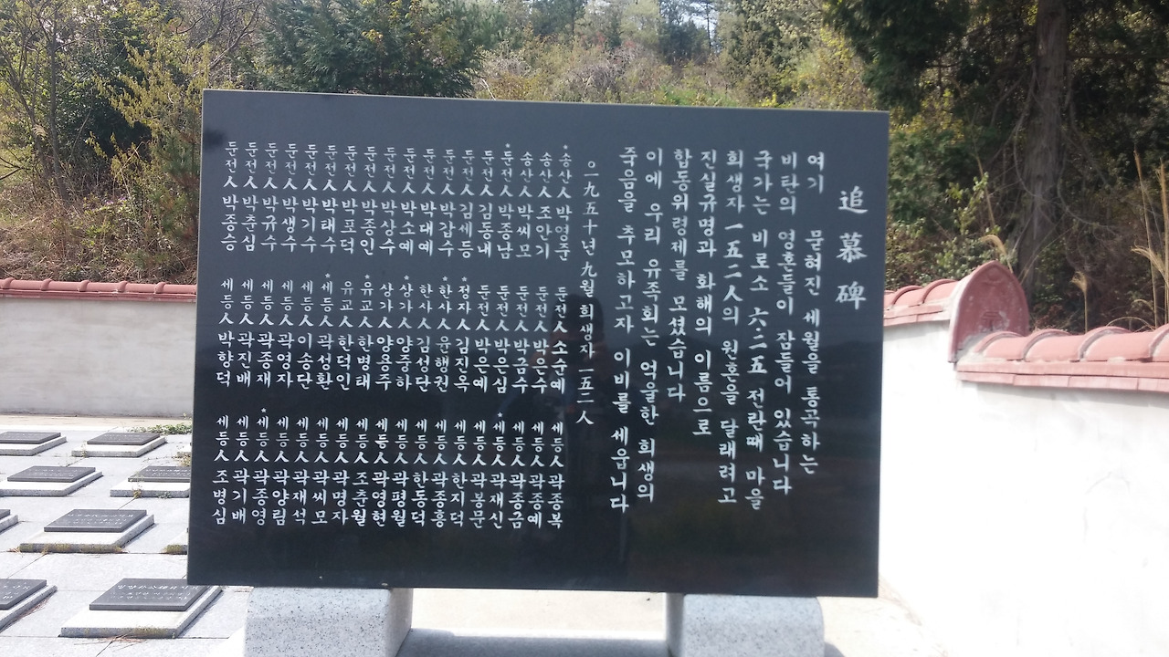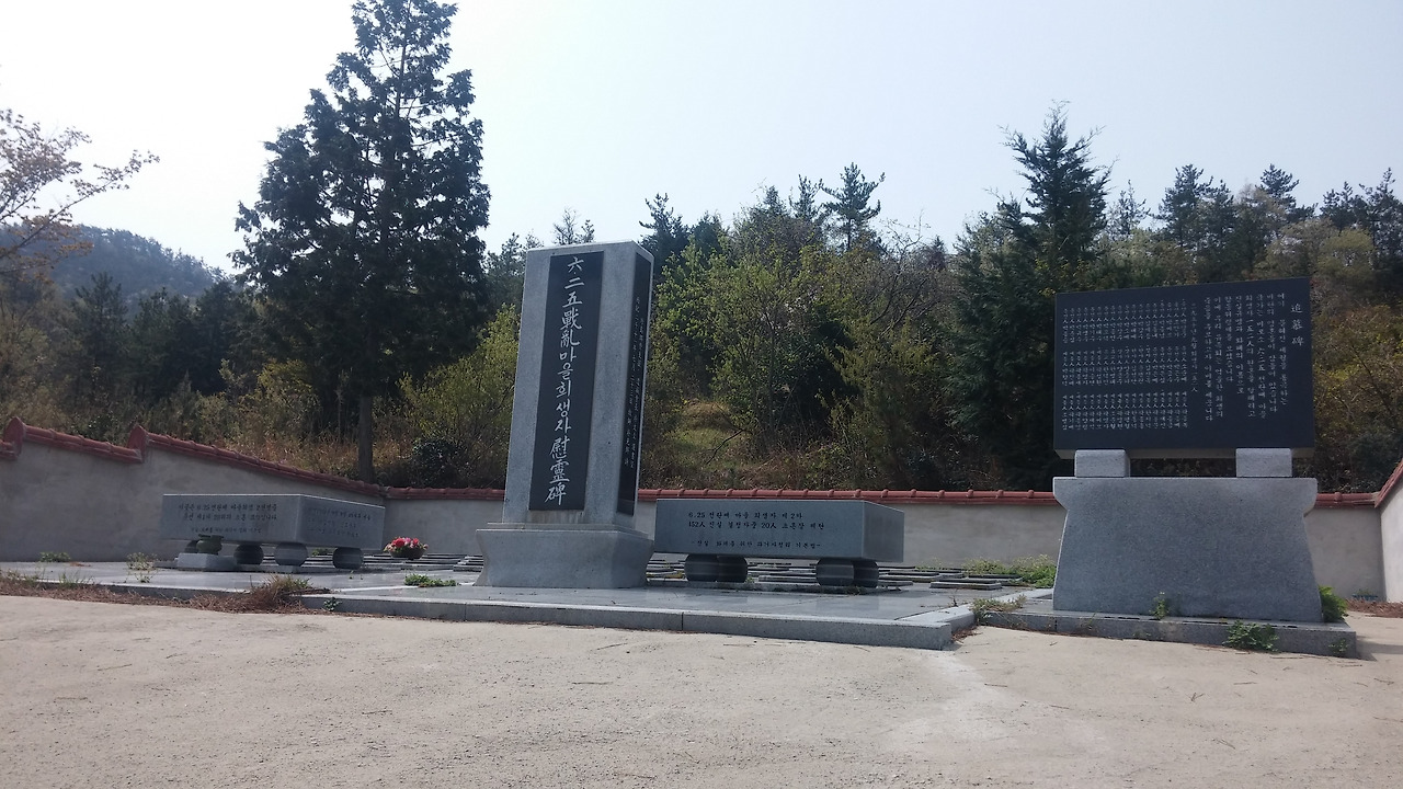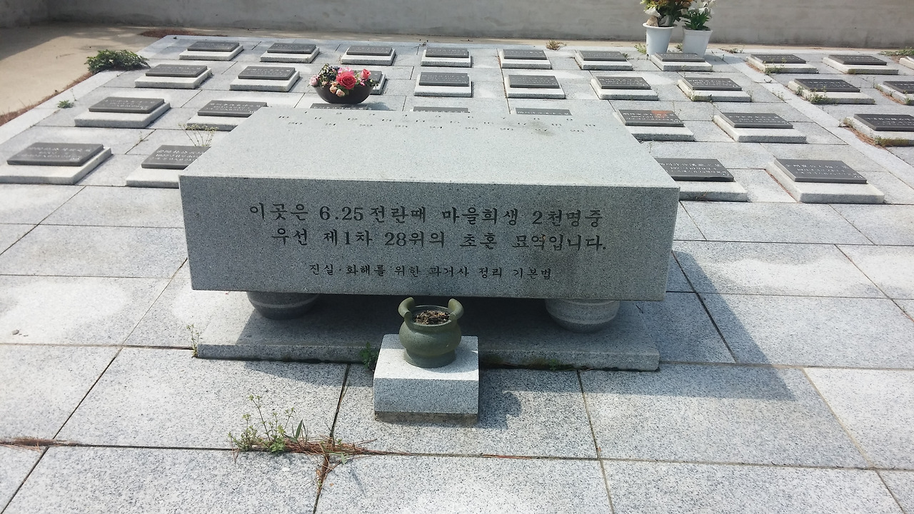 2005년 국가에 의해 설립된 <진실화해위원회>에서 세운 것이다. 위령비 양옆 두 개의 석조 분향단에는 각각 “이곳은 6‧25 전란 때 마을 희생 2천 명 중 우선 제1차 28위의 초혼 묘역입니다.”와 ‘6‧25 전란 때 마을희생자 제2차 152人 진실 결정자 중 20人 초혼자 제단’이라고 새겨져 있다. 그 옆 추모비에는 152인의 억울한 원혼을 추모한다고 적혀있다.