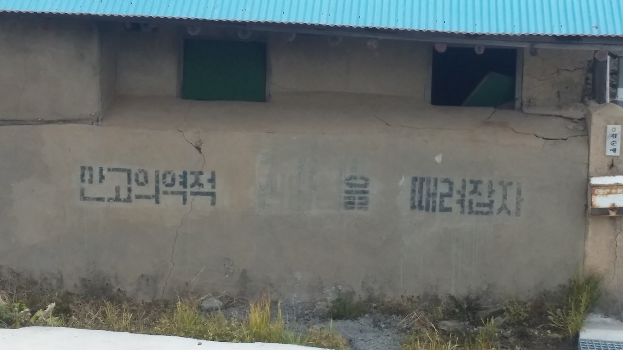 도로변 어느 폐가 벽에 빛이 바랬지만 “만고역적 OOO을 때려잡자”라는 문구가 선명하게 남아 있다. 정자체인 것으로 보아 글자 본을 떠서 그 위에 칠을 한 것 같다. 일부러 지운 흔적인 OOO을 자세히 들여다보았다. ‘김일성’이었다.