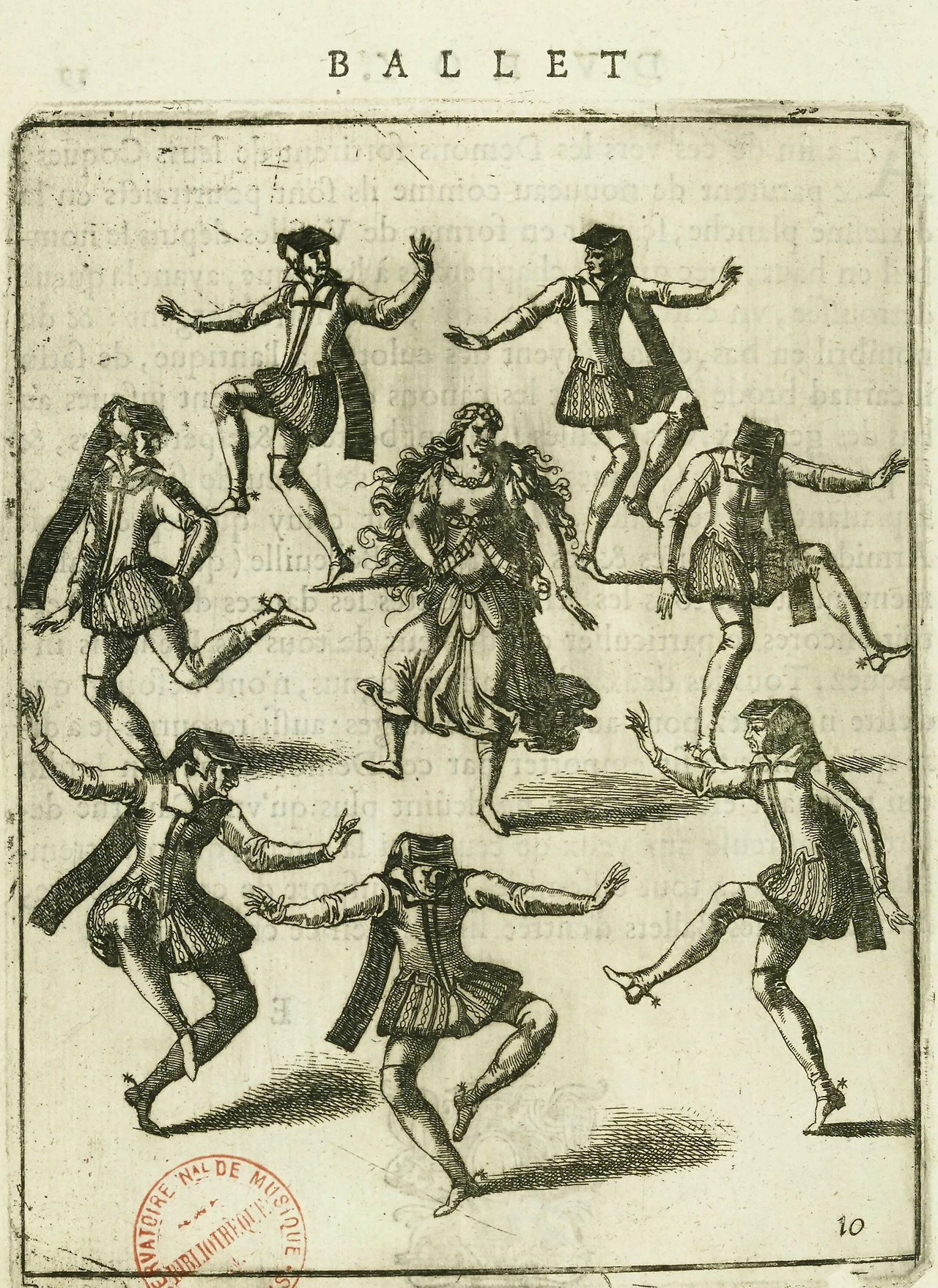 <루이 13세에게 바치는 24대의 바이올린과 12대의 오보에 합주>(1627)는 왕의 여흥을 위한 음악으로 많은 악기를 사용해 웅장함을 강조했는데 당시.유행하던 여러 발레곡에서 선별한 음악을 배치했다. 흥미로운 것은 각 곡에 '스위스인 Les Suisses', '아메리카인 Les Ameriquains'과 같은 제목이 붙어있는데 이런 제목을 가진 춤곡은 '국가의 발레 Ballet des Nations'라고 불렀다. 외국인 분장을 한 댄서들이 왕실 무대에 등장해 퍼레이드를 벌였는데 프랑스의 국제적 영광, 해외로 뻗어나가는 왕의 통치력을 상징하는 상징으로 외국인 분장이 활용되었다. '님프 Les Nimphes'라는 제목의 발레곡은 아마도 목가적 취미에서 기원한 것으로 보이는데, 그 당시 궁정발레의 주제가 고대 신화, 목가적 취미, 정치적 선전에서 온 것을 알 수 있다.
