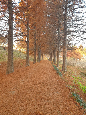 메타세쿼이아숲길은 그 파랐던 잎이 바래어 떨어져 이불처럼 길 위를 덮었다.