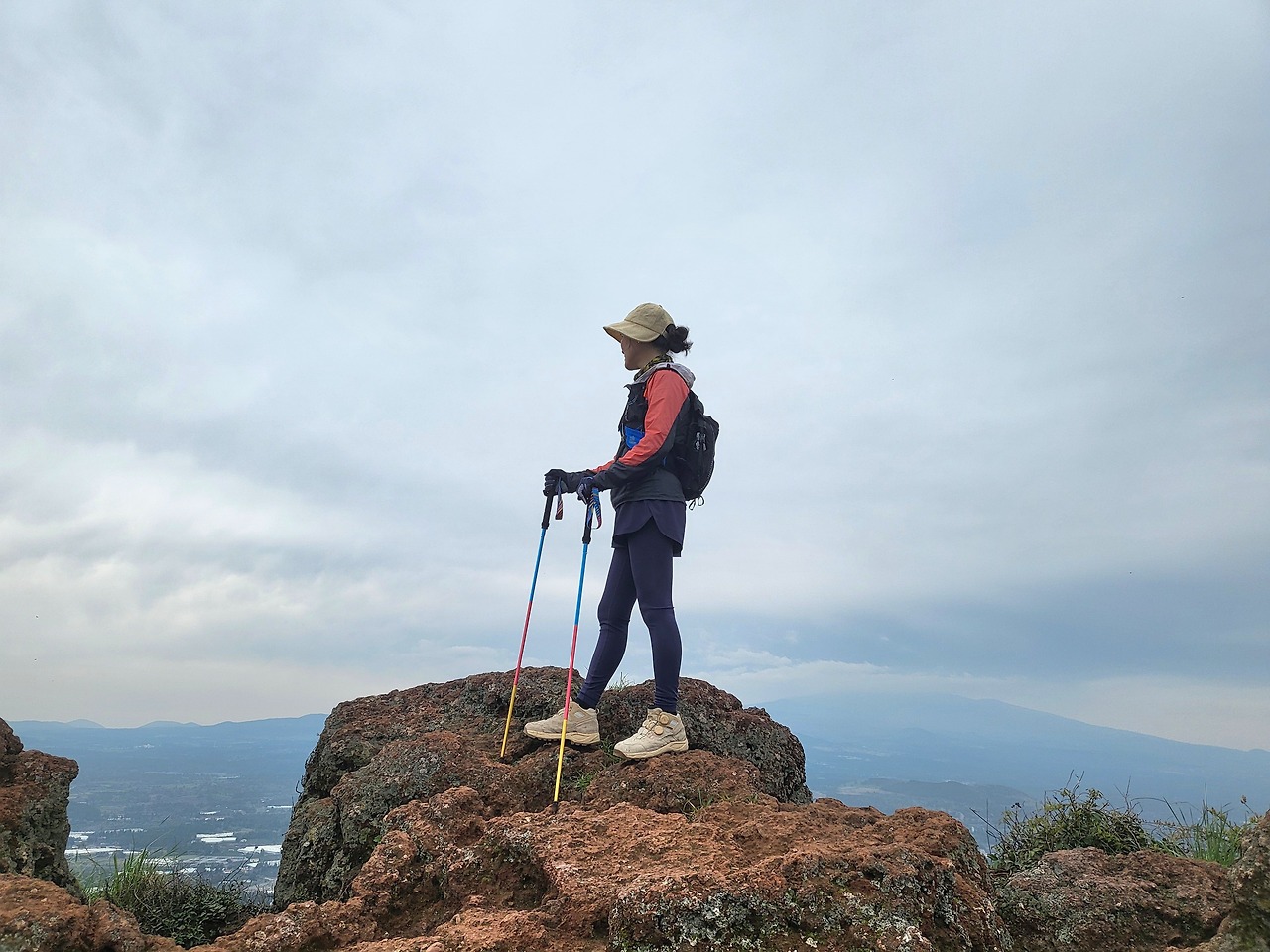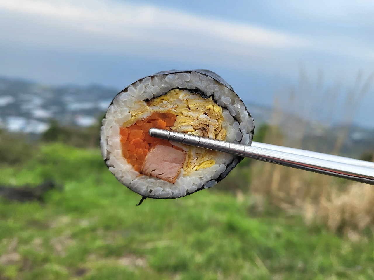 조심조심 힘 빠진 다리를 챙겨 정상부에서 내려오니 점심 먹을 수 있는 나무 의자가 있었다. 요리할 수 있는 에어비앤비 숙소를 선택한 덕분에 아침에 김밥을 준비했다. 제주 달걀을 얇게 여섯 장 부쳐 곱게 채 썰고, 제주 당근 2개도 깨끗이 씻고 채 썰어 맛소금 한 꼬집 넣고 살짝 볶았다. 육지 스팸은 적당하게 썰어 노릿하게 굽고 즉석밥을 전자레인지에 데웠다. 김에 밥을 깔고 채 썰어 둔 달걀 지단과 당근, 햄을 넣고 야무지게 말았다. 아침 식사로 그리고 점심 도시락으로도 쌌다. 군산 정상에서 제주 풍경을 발아래 펼쳐두고 도시락을 펼치니 세상을 다 가진 것 같다. “음! 맛있다. 맛있어! 꿀맛이네! 싸 오길 너무 잘했다!” 극성맞음이 입을 즐겁게 했다.