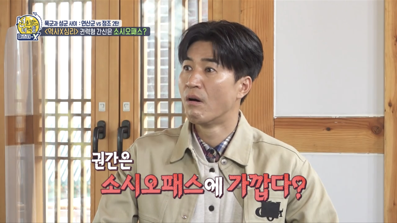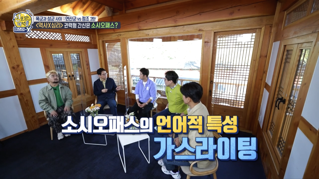 그런데 출연진이 조금 특이하다. 이제껏 많은 교양 예능은 각 분야의 전문가들과 MC형 예능인 혹은 연륜 있는 연예인들이 주 패널들이었다. 그들의 정제되고 깊이 있는 대화는 교양 예능만의 톤을 형성하는데 일조했다. <선을 넘는 녀석들: 마스터X> 역시 역사학자 김용환과 MC 전현무, 고학력자 연예인 유병재를 섭외하여 일반 교양 예능의 문법을 따르는 듯 보였다. 하지만 <선을 넘는 녀석들: 마스터X> 제작진들은 묘수를 던진다. 허당미의 대가, 김종민을 섭외한 것이다.