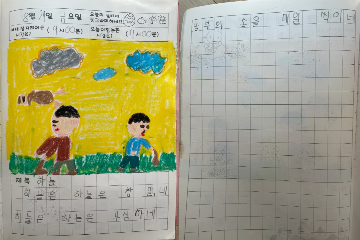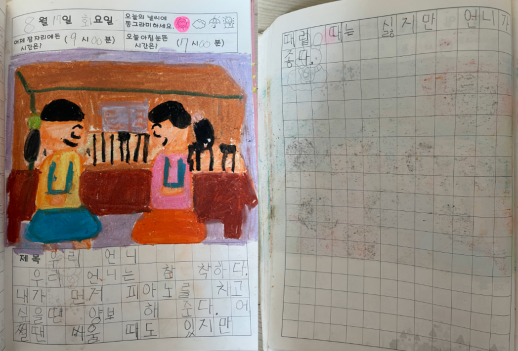 어릴 적 인터넷을 통한 정보화시대의 도약을 목도하면서 온라인 세상을 정보의 바다라고 표현했던 기억이 난다. 정보의 바다라는 망망대해에 내가 만든 쇼츠들은 마치 아무도 처리할 수 없는 디지털 쓰레기가 되어 둥둥 떠다니는 것만 같았다. 그래서 2만 6천 회의 조회수를 얻은 틱톡 영상을 끝으로 나는 더 이상 영상을 만들어 올리지 못했다. 그렇지만 약 2주간의 짧은 시간 동안 유튜버, 틱톡커가 되어 본 것이 무의미하다고 생각하지는 않는다. 하기 싫은 것을 억지로 하려고 보니 다시 글을 쓰고 싶어 졌기 때문이다. 예전에 글을 적어 올리다가 지워버린 브런치가 생각났다. 작가로서의 삶이라고 표현하기에는 거창하지만, 그것이 나에게 더 맞을 것 같았다. 나는 아무래도 아직까지 아날로그에 더 가까운 인간인 것 같다. 그 무렵 부모님이 집을 정리하시다가 내가 초등학교 1학년 때 썼던 그림일기를 포함해 6년간의 일기집을 모아둔 묶음을 찾아내셨는데 아빠는 그게 너무 재밌다며 며칠 밤을 퇴근하신 후 내 일기를 읽으셨다고 한다.