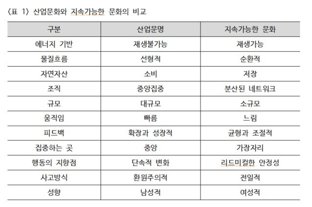 데이비드 홈그랜은 퍼머컬처는 새로운 문화를 지향하고 있다며 지금의 산업문화와 미래의 지속가능한 문화를 아래의 표처럼 비교하면서 퍼머컬처가 말하는 지속가능한 문화가 무엇인지 짐작하게 해준다. 퍼머컬처는 <표 1>의 특징을 가진 인류의 새로운 문화를 지향한다.