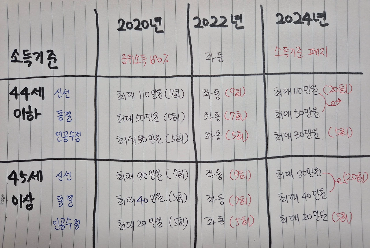 글을 쓰기 위해 찾아본 난임시술 정부지원금은 내가 처음 시험관시술을 하던 2020년과 동일했다. 하지만 소득기준 요건이 폐지됐고, 지원 횟수가 큰 폭으로 늘어 전보다 많은 사람들이 수혜를 받고 있었다.