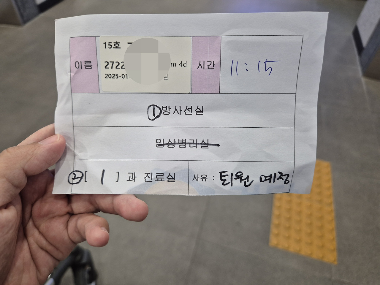 입원 생활은 갑갑했지만, 아이의 몸상태는 하루가 다르게 좋아졌다. 그리고 병원에서 네 밤을 자고 일어난 아침, 간호사 선생님이 방에 들어오셔서 종이 한 장을 주고 가셨다. 마지막으로 엑스레이 촬영을 하고, 원장님 진료를 받으면 퇴원이라고 했다. 종이에 적힌 '퇴원예정'이 이렇게 반가울 수가 없었다.