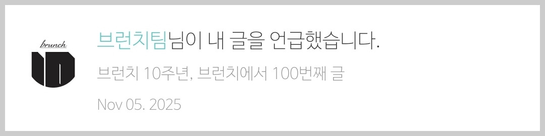 띠링, 오랜만에 브런치팀에서 알림이 왔다. 브런치에서 내 글을 언급했다는 거였다. 그동안 글을 쓰라는 독촉 알림만 받다가, 내 글을 언급했다는 낯선 알림을 받자, 그 짧은 문구에 심장이 두근세근 콩닥쿵덕 뛰었다. 구독자 268만 명의 파워 스피커 브런치팀이 '내 글을 왜 언급했을까?' 하는 기대감에 냉큼 초대 알림을 눌렀다.