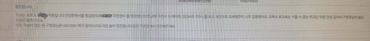 '직위는 모르고 OOO 직원입니다. 인감증명서를 발급받으러 OO동 주민센터를 방문했는데, 발급해 주면서 다 헤어진 인감보관 주머니를 보고 새것으로 교체해 주어 너무 감동했어요. 교육의 효과로는 거둘 수 없는 타고난 착한 인성 같아요. 구청장님의 솔선수범은 물론이고요. 이런 직원이 있는 한 구청장님은 4선, 5선도 제가 밀어드리죠. 높이 칭찬합니다. 많은 직원 앞에서 칭찬해 주세요'