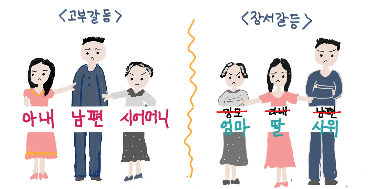 고부갈등 : 아내, 남편, 시어머니 / 장서갈등 : 엄마, 딸, 사위