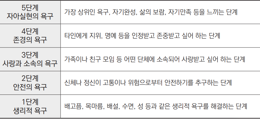 1단계가 배고픔, 배설, 목마름, 수면, 성과 같은 생리적 욕구를 해결하는 단계이다. 그리고 가장 상위 단계인 5단계는 자기완성, 삶의 보람, 자기만족을 느끼는 단계인 자아실현의 욕구를 해결하는 단계이다.
