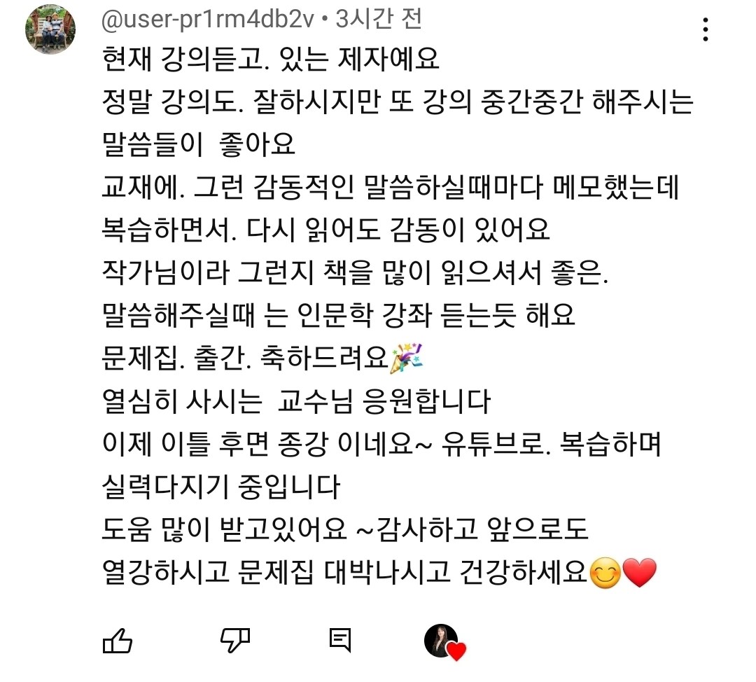 요양보호사 시험을 도와드리기 위해 운영 중인 유튜브 채널에 적힌 최근의 댓글이다. (이 분은 교육원에서 정규 수업을 듣고 있는 제자, 선생님이다.)