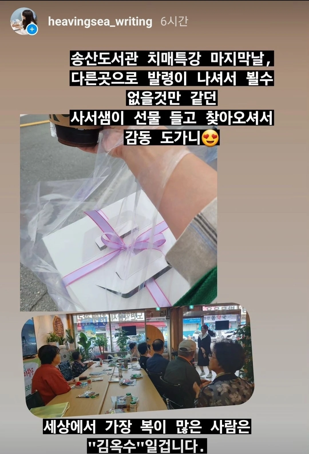 커피와 케이크를 건네주시며 감사하다는 인사도 받았다. 이런 대접을 받게 될 거라는 생각은 해 본 적이 없다. 그날의 감동은 1년이 지난 지금도 여전히 내 안에 고스란히 박혀있다. 세상에서 가장 인복이 많은 사람으로 만들어 주었기 때문이다. 이 사서 선생님은 인스타그램에서 오늘도 응원을 보내주시는 든든한 응원군으로 남아계신다.